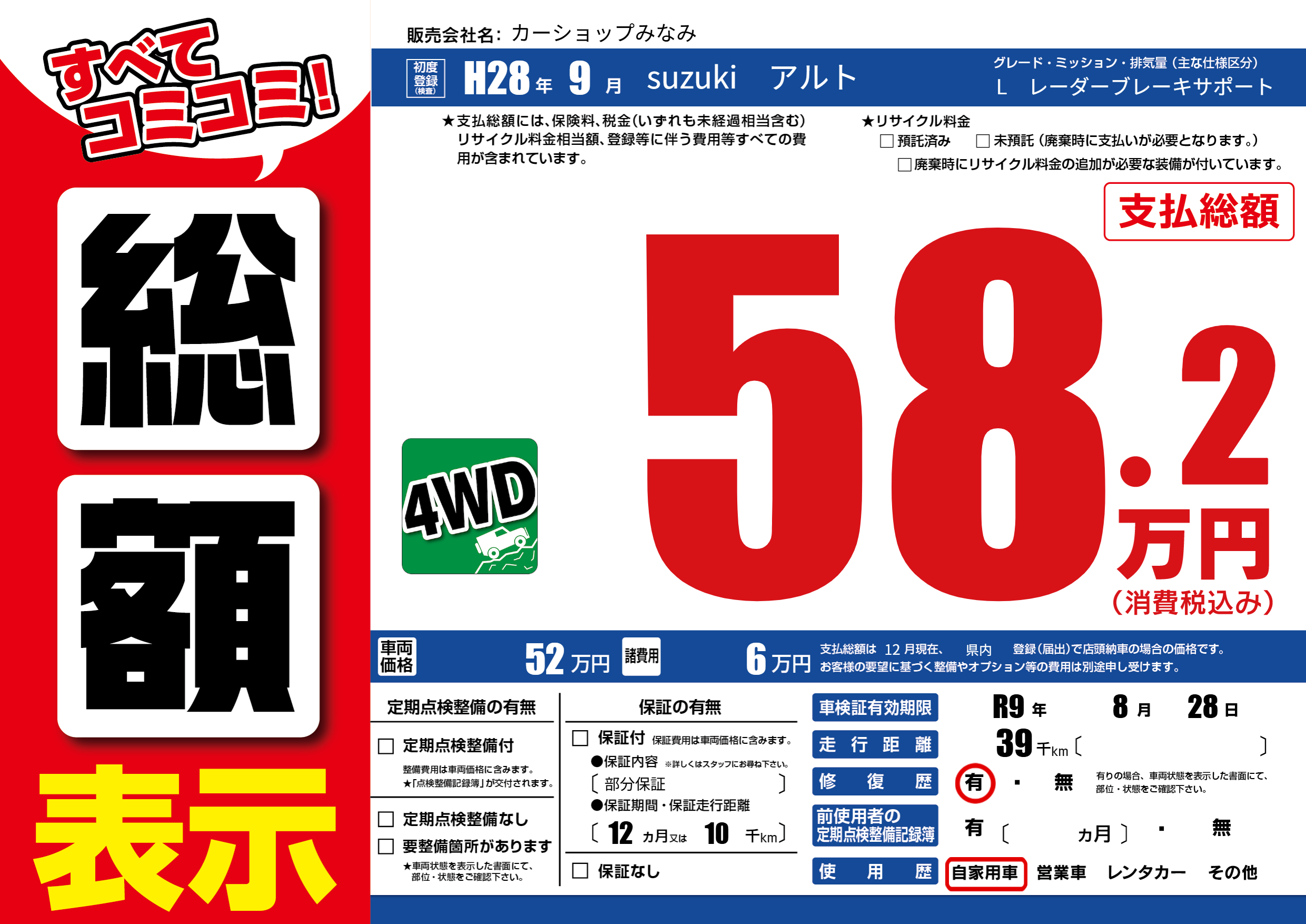 | 車名 | suzuki アルト | グレード ミッション 排気量 |