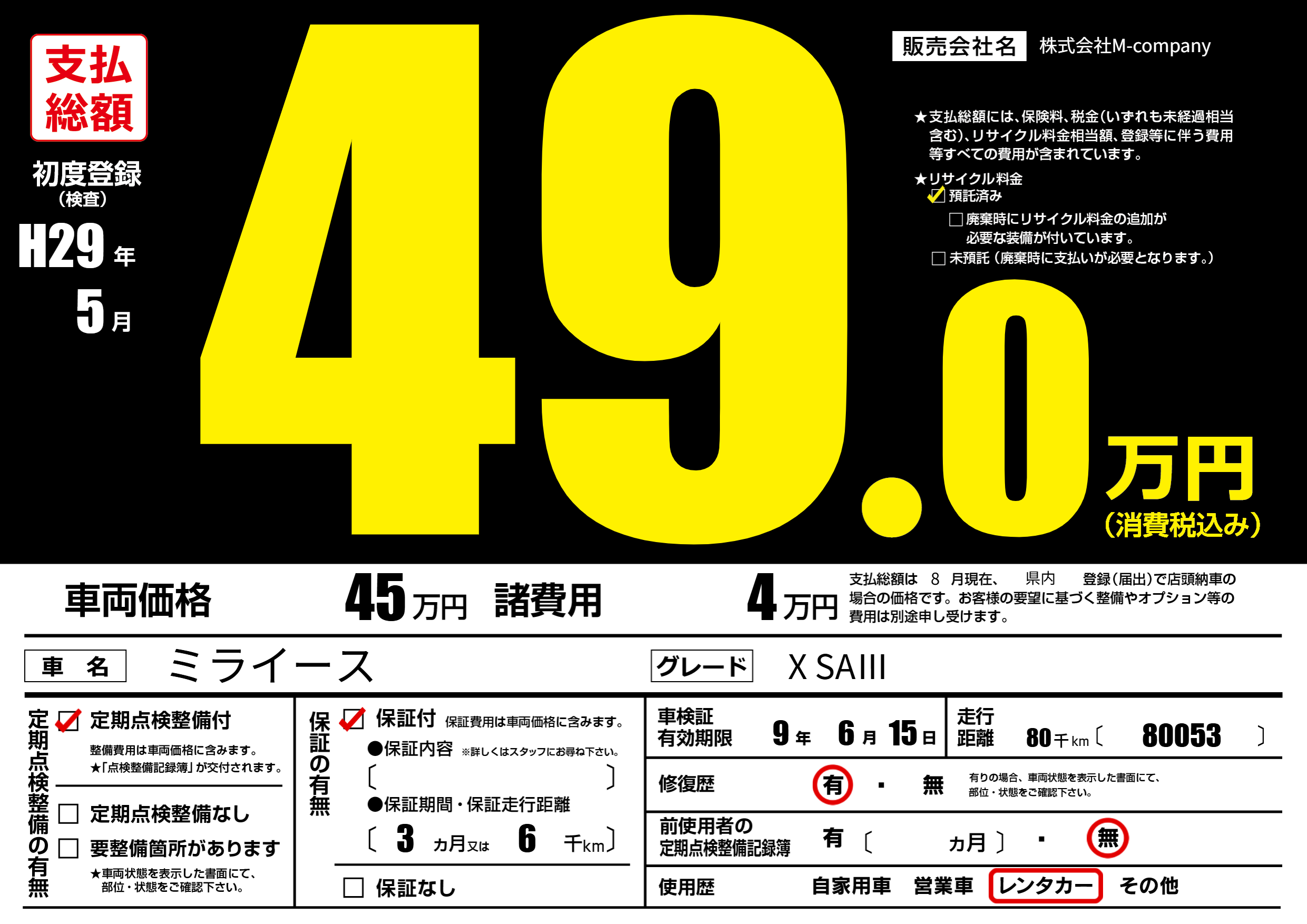 | 走行キロ | 8万km | 初年度登録 | H29年5月 |