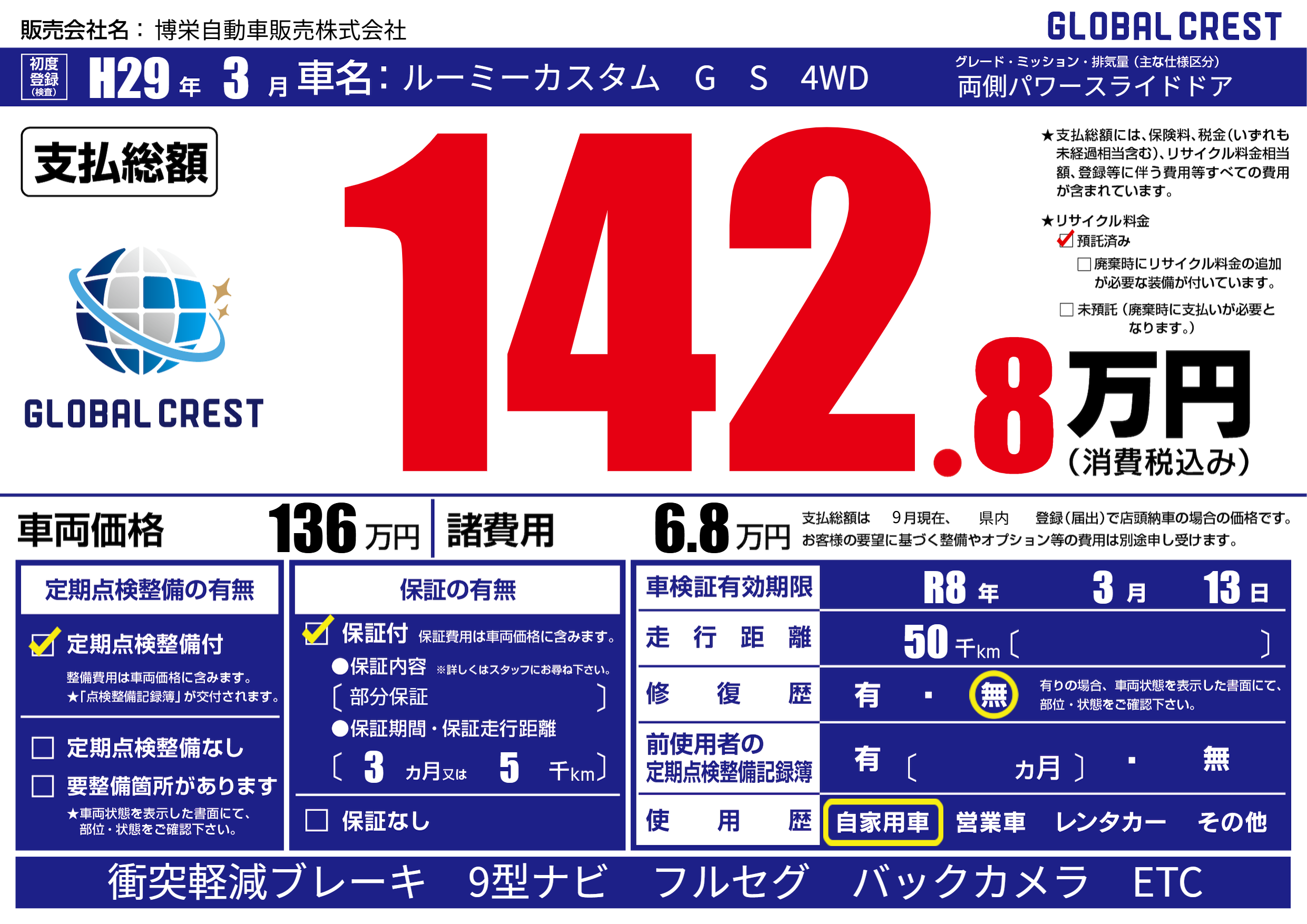 | 走行キロ | 5万km | 初年度登録 | H29年3月 |