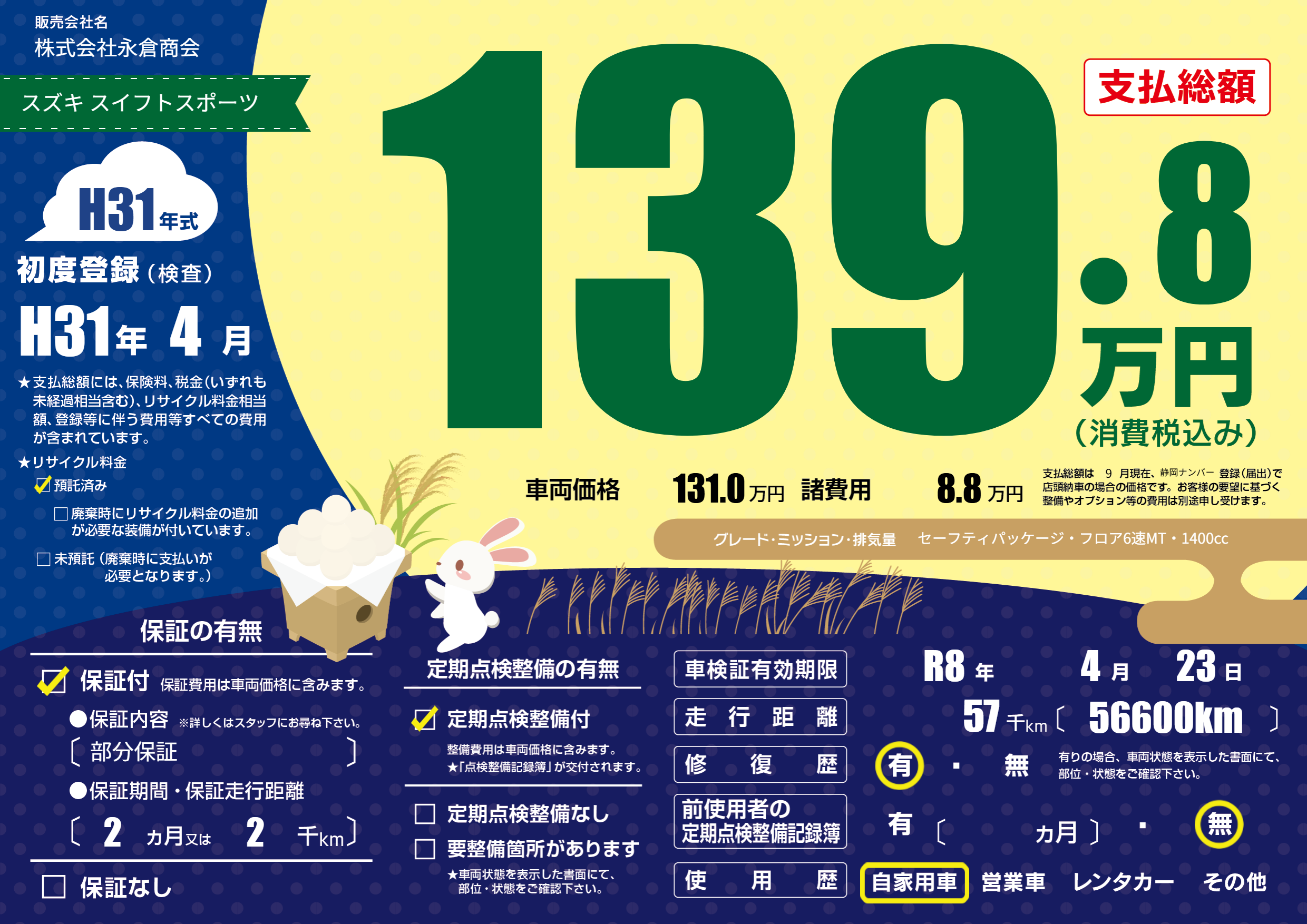 | 車名 | スズキ スイフトスポーツ | グレード ミッション 排気量 |