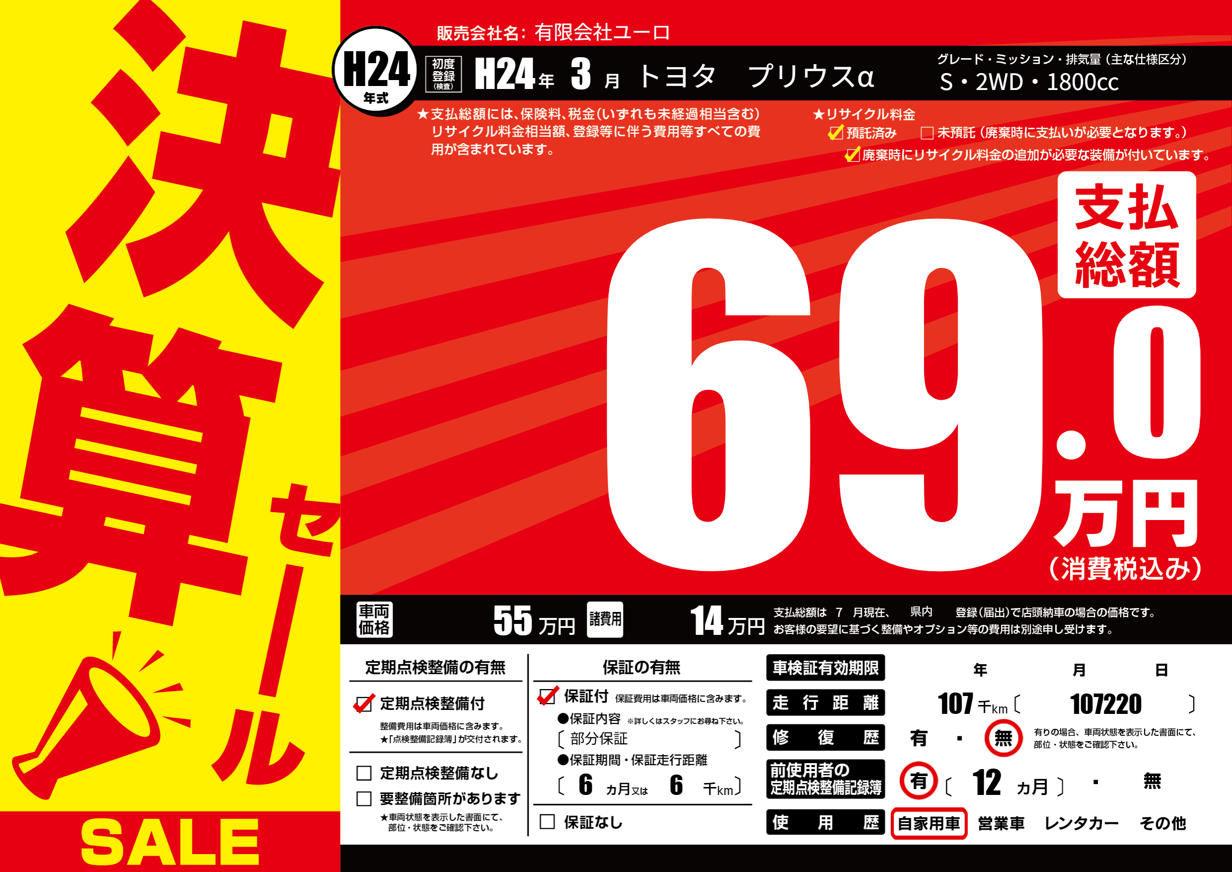 | 走行キロ | 10.7万km | 初年度登録 | H24年3月 |