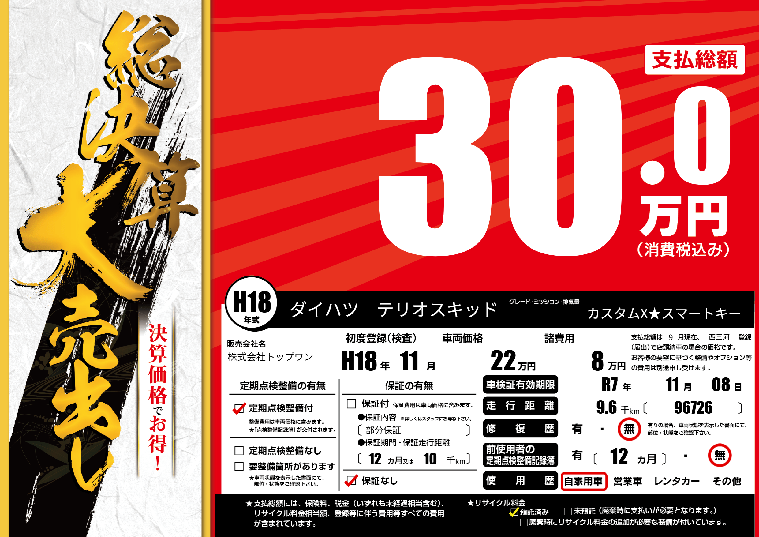 | 走行キロ | 0.9万km | 初年度登録 | H18年11月 |