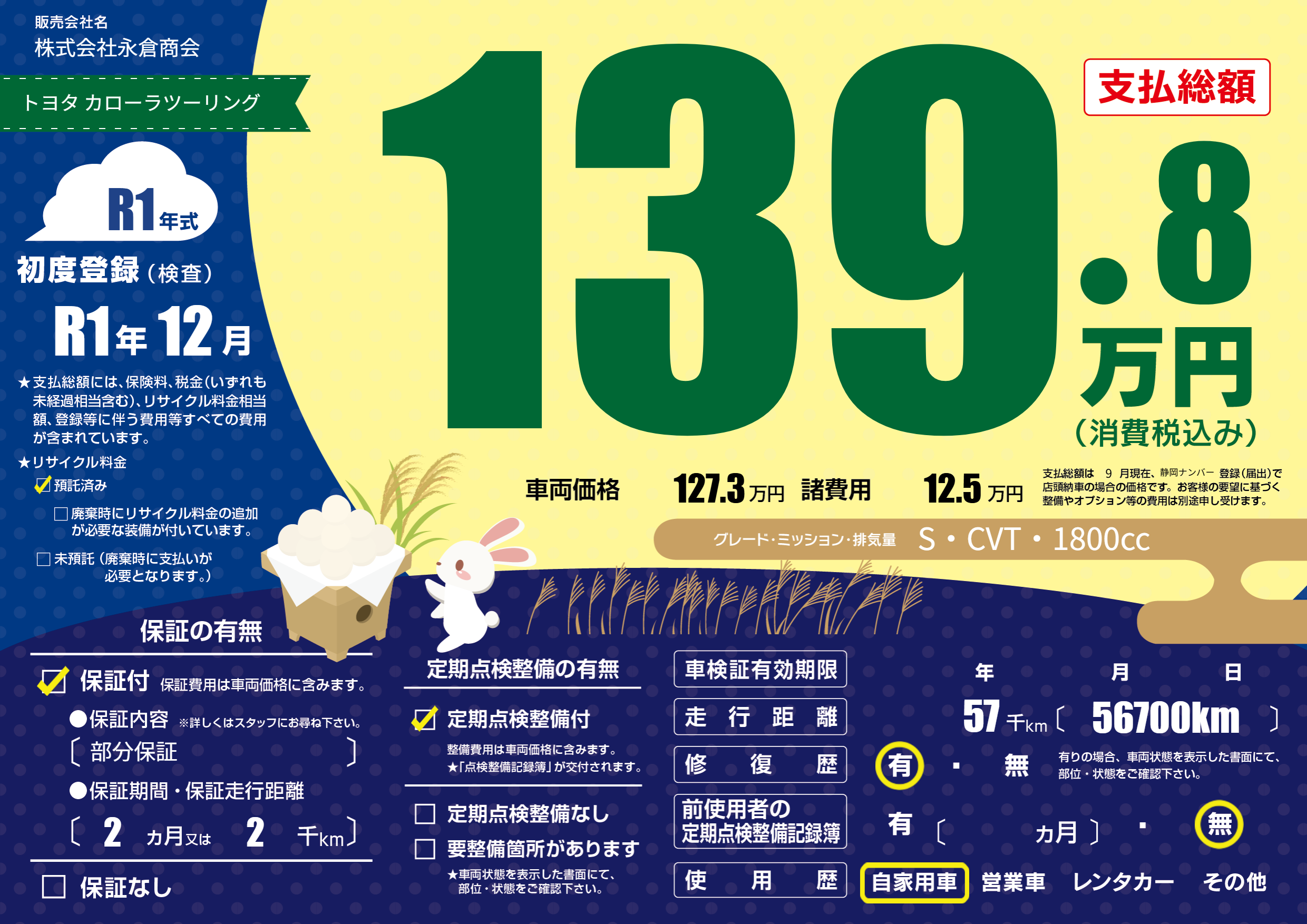 | 走行キロ | 5.7万km | 初年度登録 | R1年12月 |