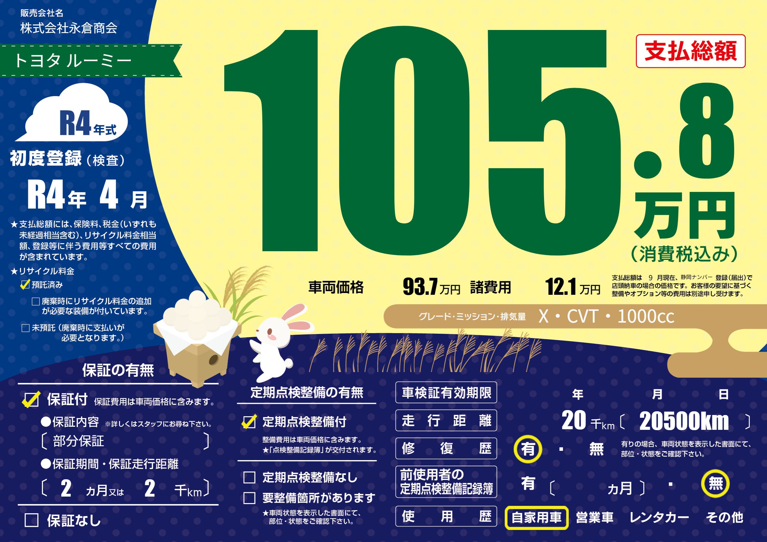 | 車名 | トヨタ ルーミー | グレード ミッション 排気量 |