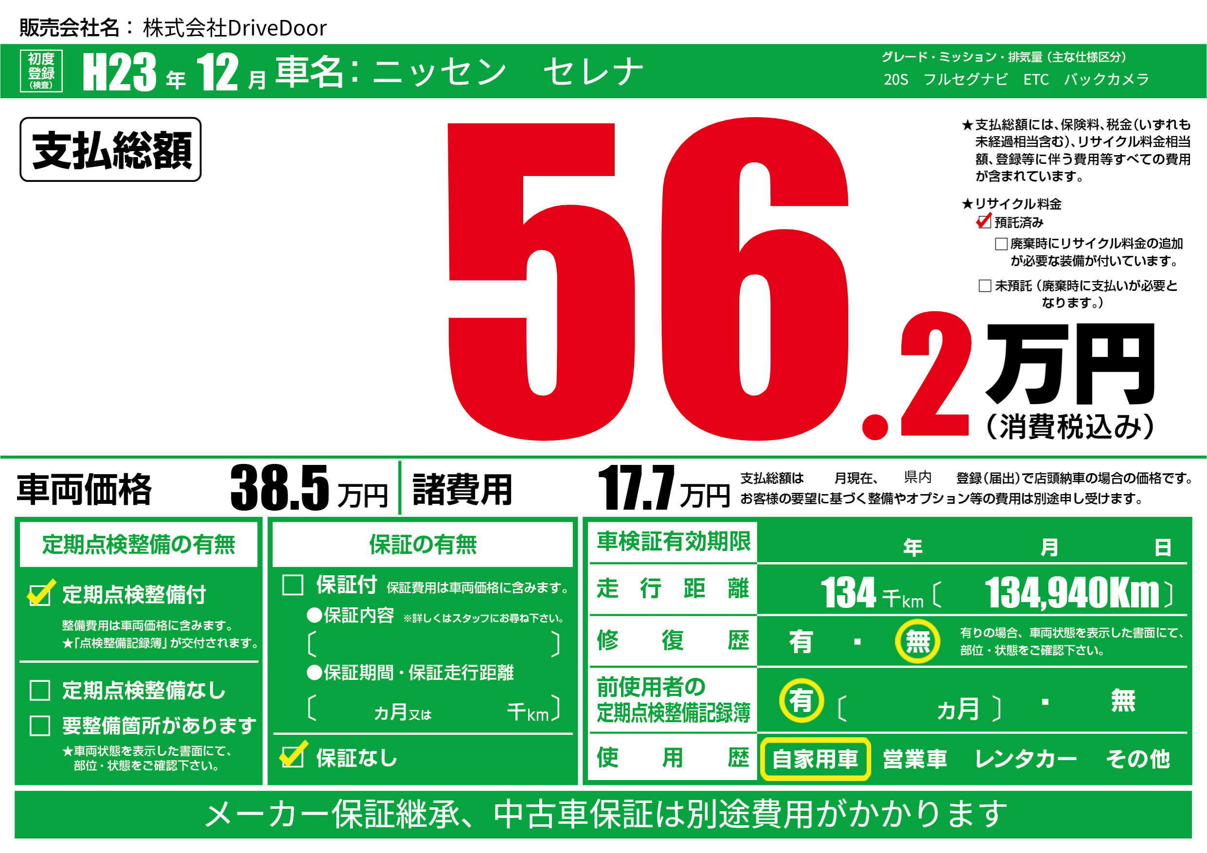 | 走行キロ | 13.4万km | 初年度登録 | H23年12月 |