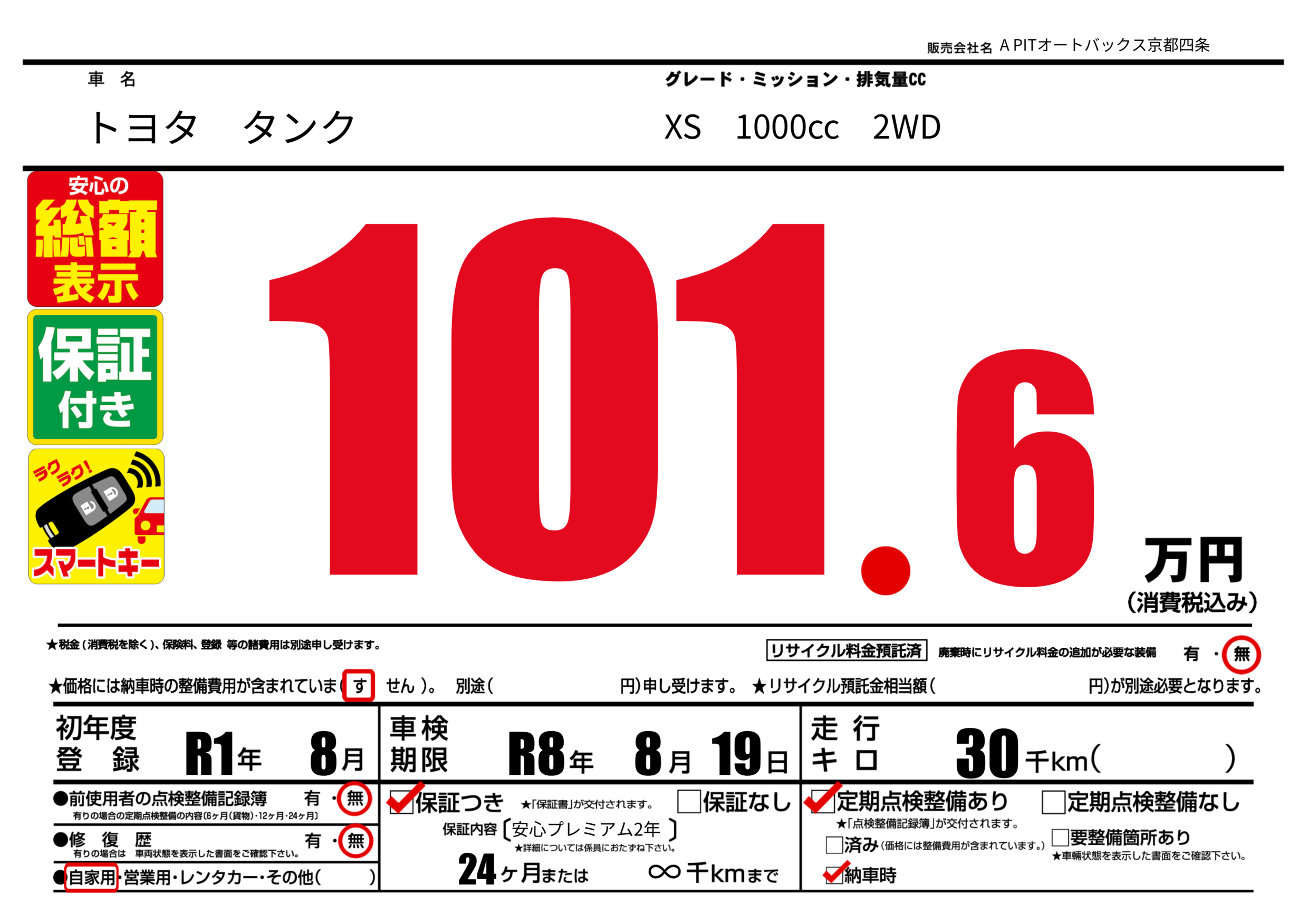 | 車名 | トヨタ タンク | グレード ミッション 排気量 |