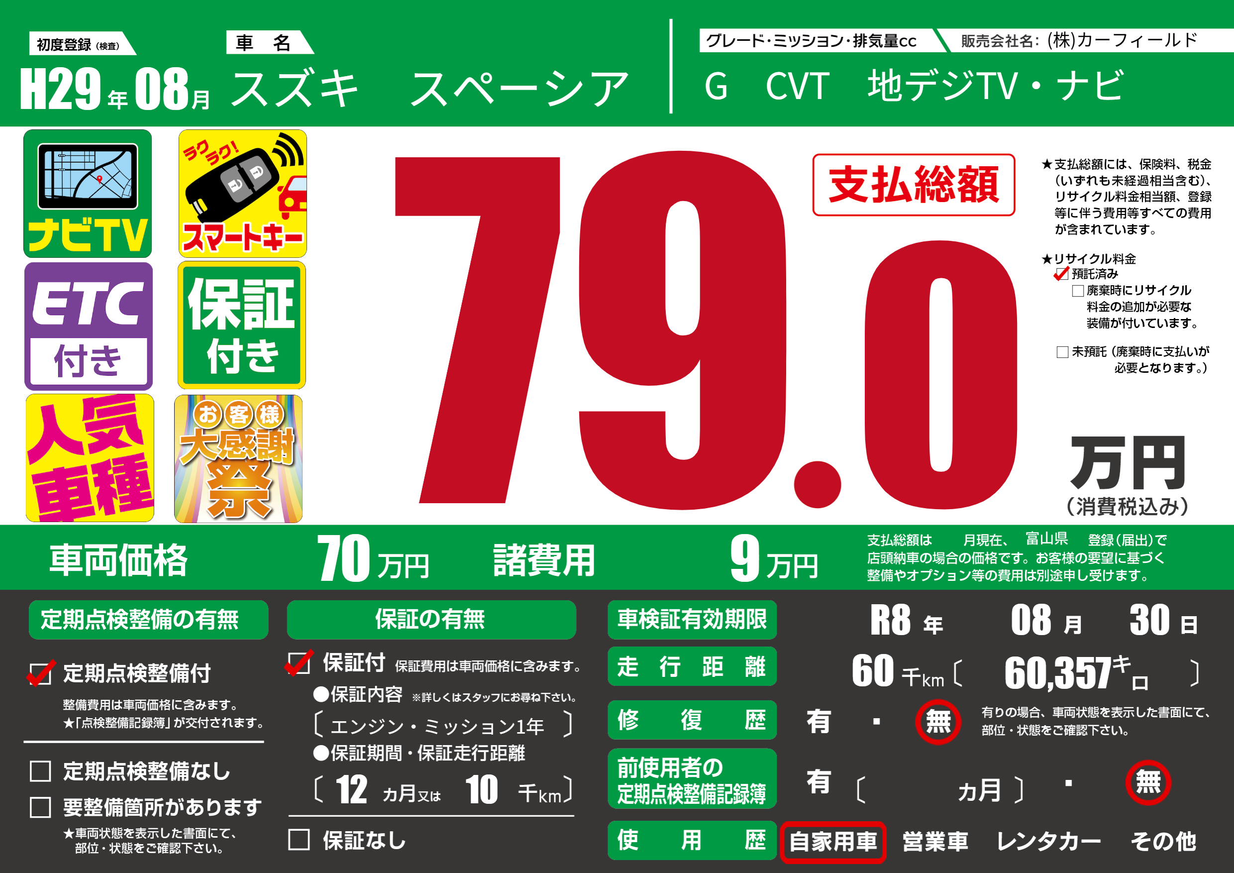 | 走行キロ | 6万km | 初年度登録 | H29年08月 |