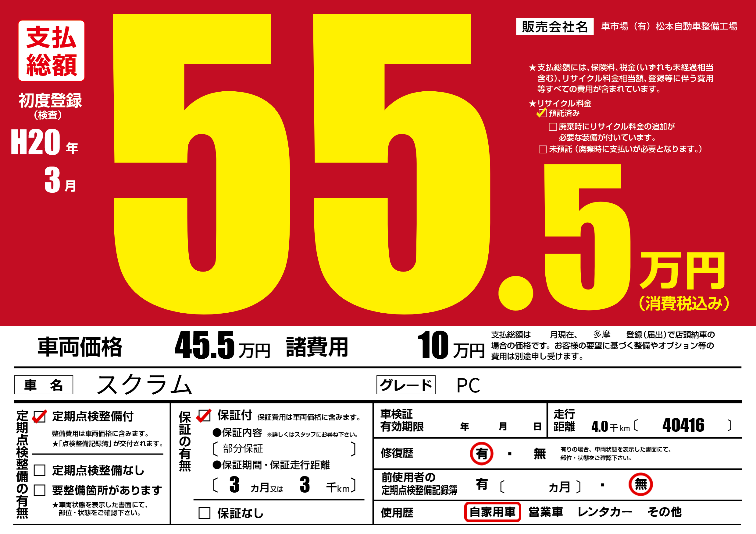 | 車名 | スクラム | グレード ミッション 排気量 |