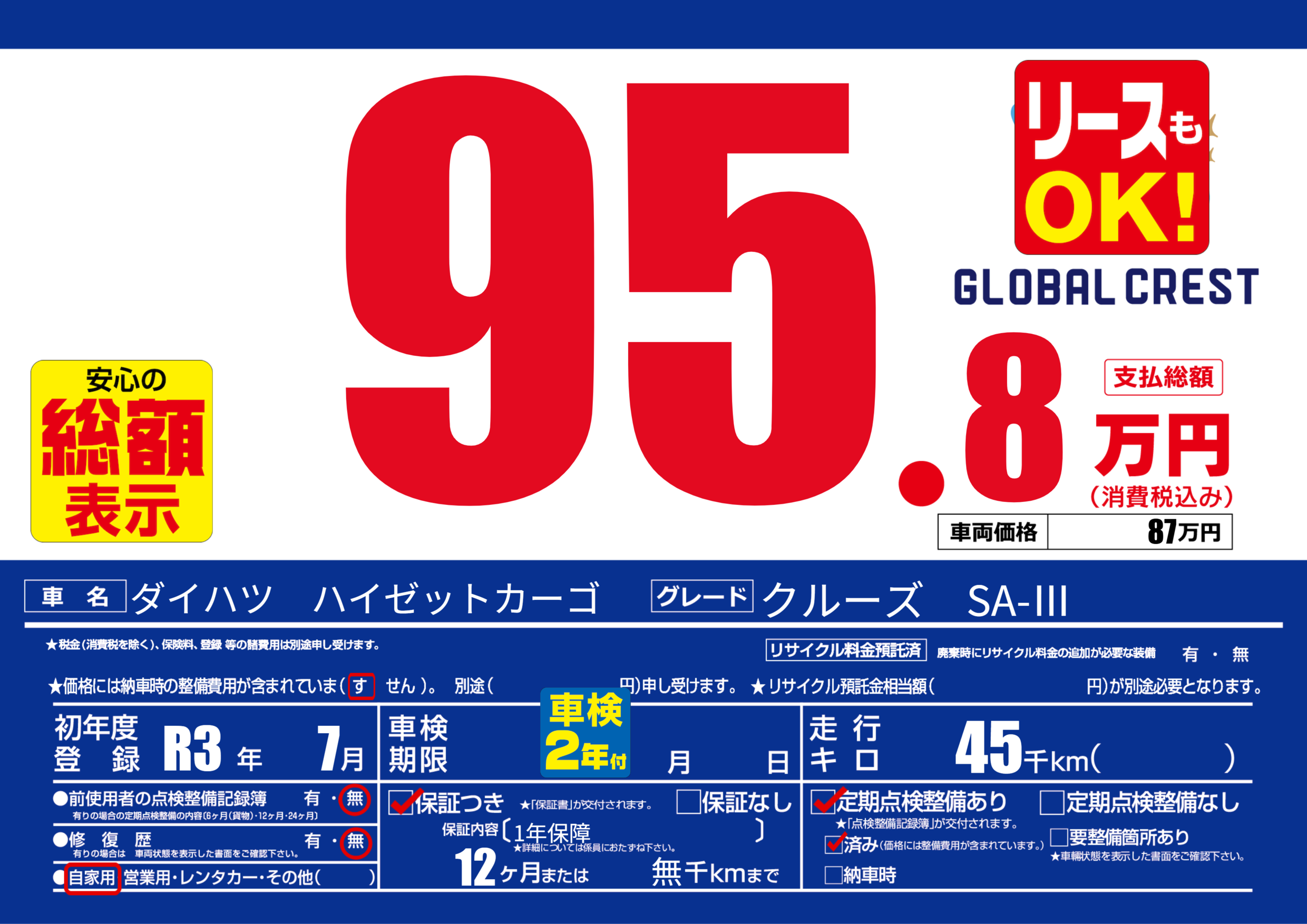 | 定期点検整備 | 定期点検整備あり 定期点検整備済み | ||