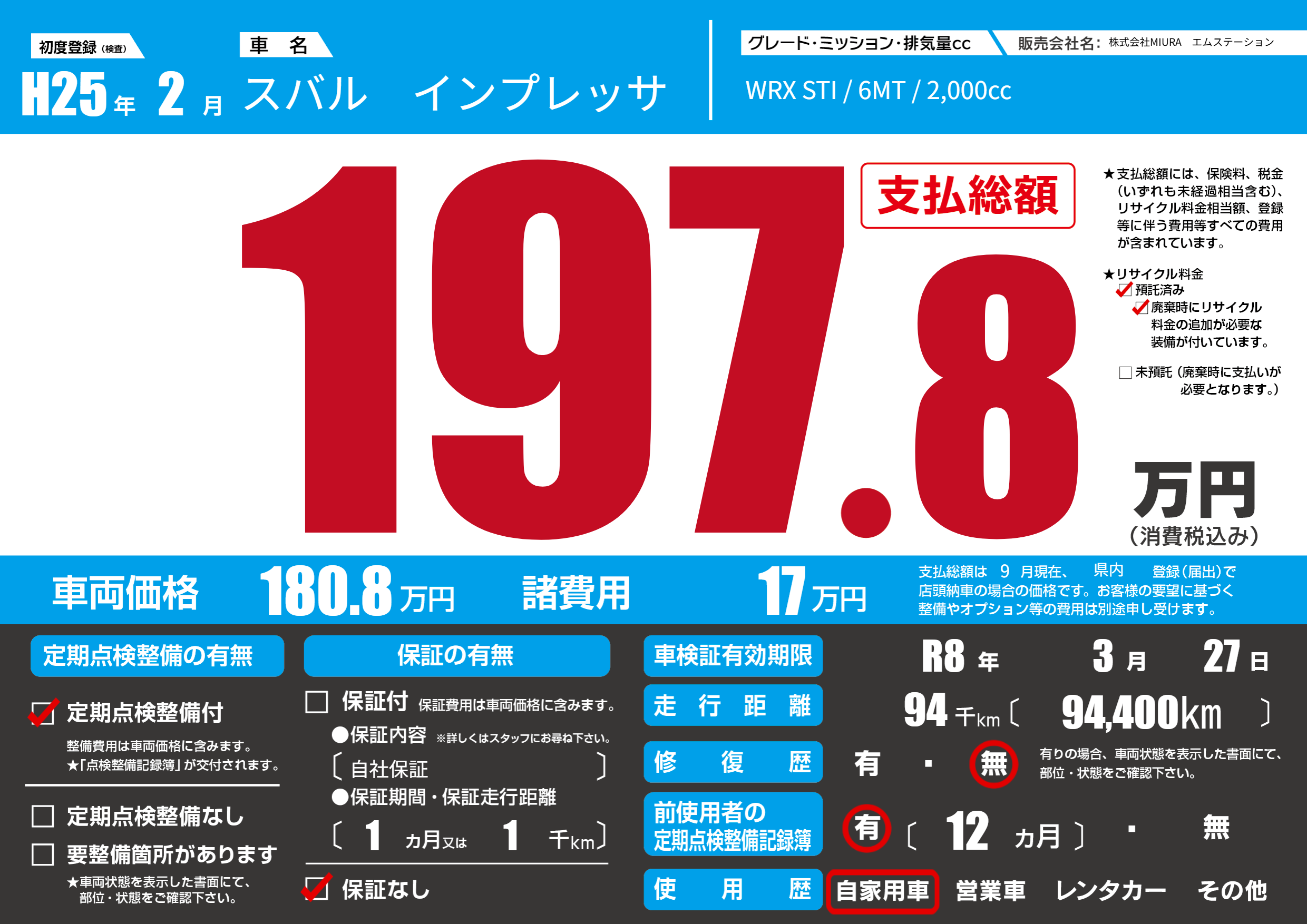 | 車名 | スバル インプレッサ | グレード ミッション 排気量 |