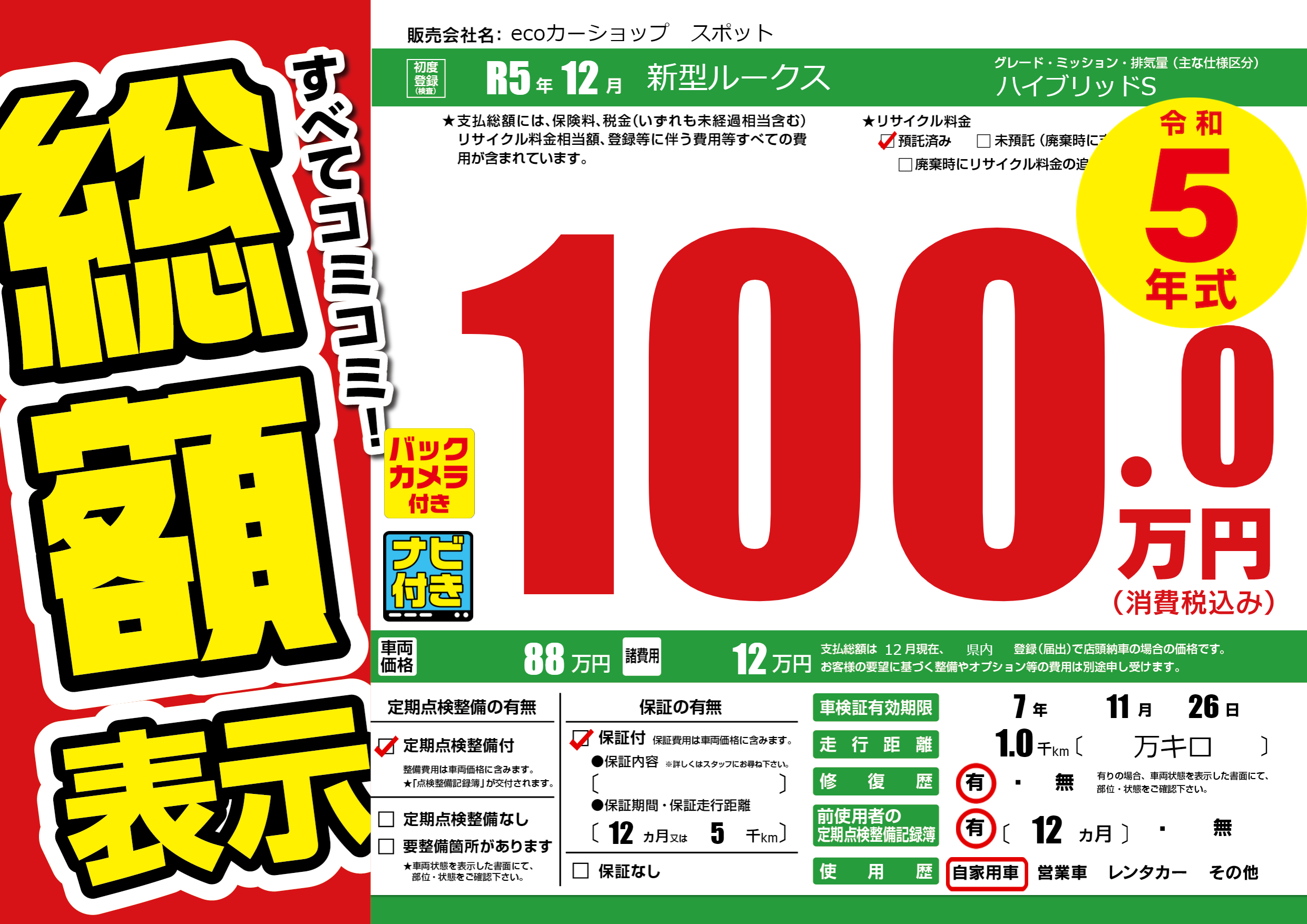 保証付き 保証内容(---) 12ヶ月または(5)千kmまで |