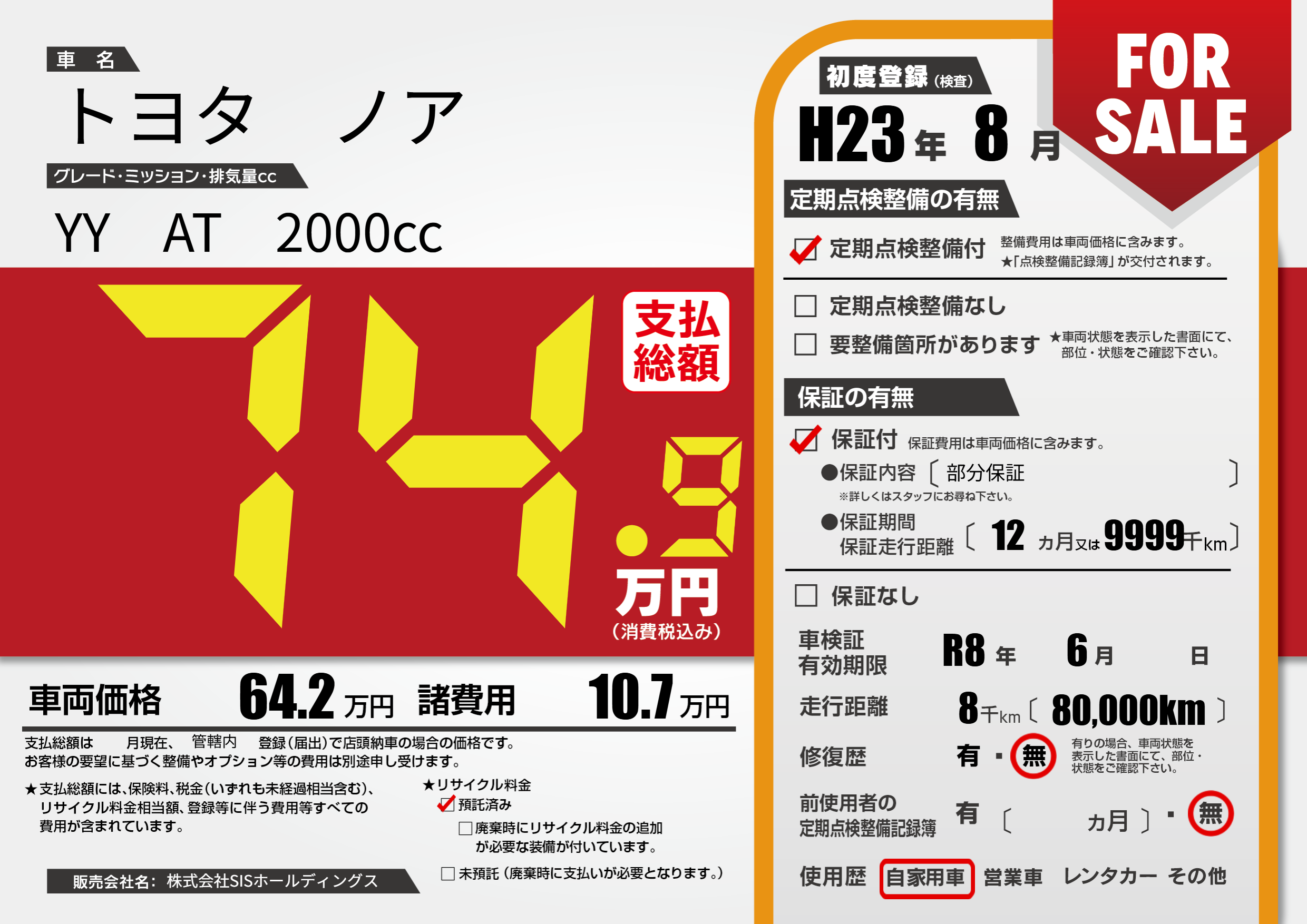| 走行キロ | 0.8万km | 初年度登録 | H23年8月 |