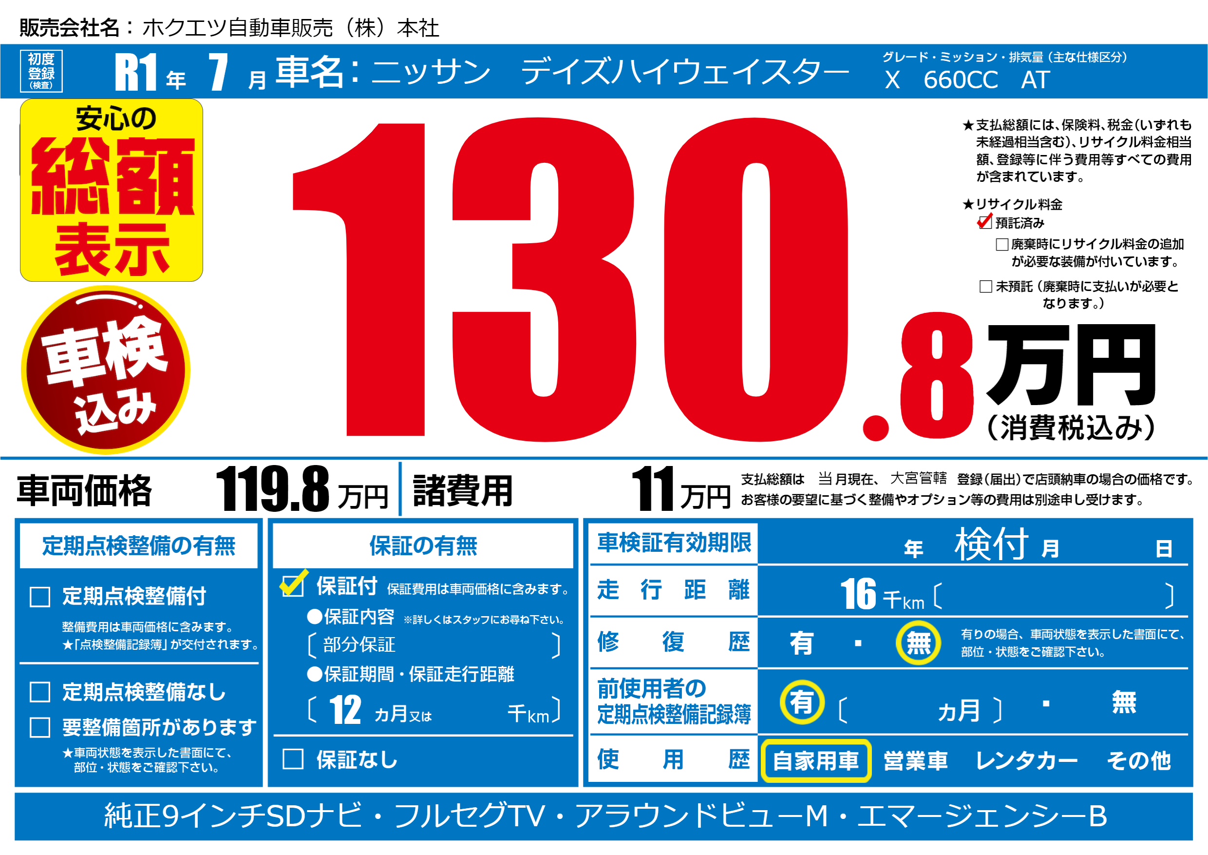 | 車名 | ニッサン デイズハイウェイスター | グレード ミッション 排気量 |