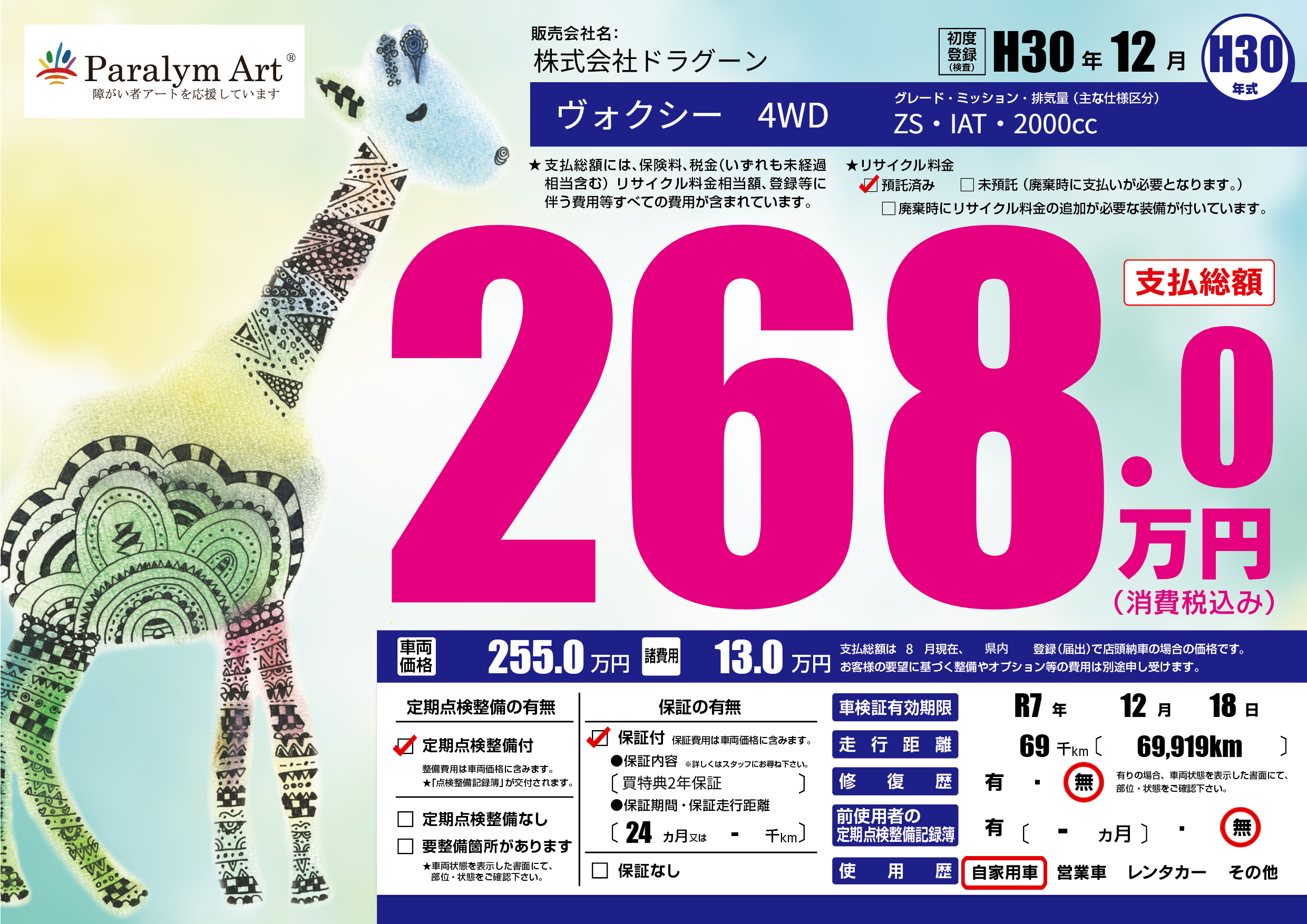 | 車名 | ヴォクシー 4WD | グレード ミッション 排気量 |
