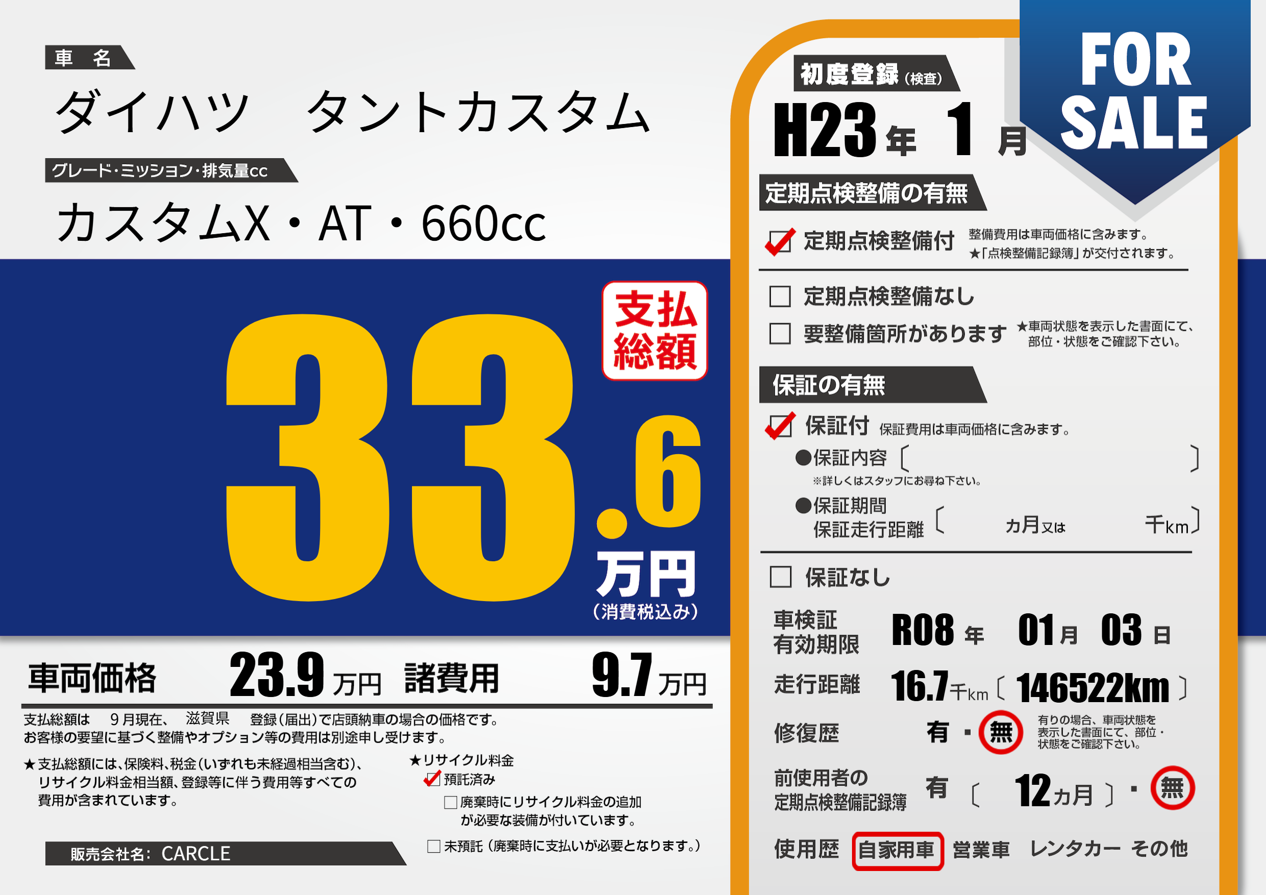 | 車名 | ダイハツ タントカスタム | グレード ミッション 排気量 |