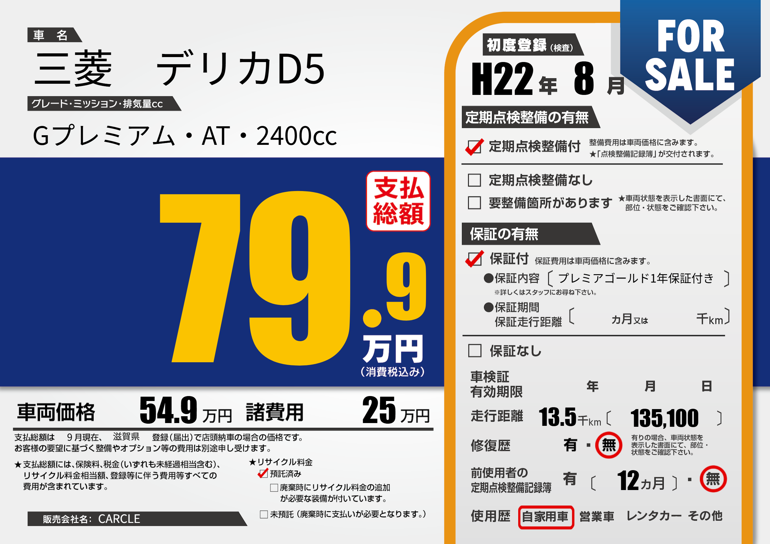 | 車名 | 三菱 デリカD5 | グレード ミッション 排気量 |