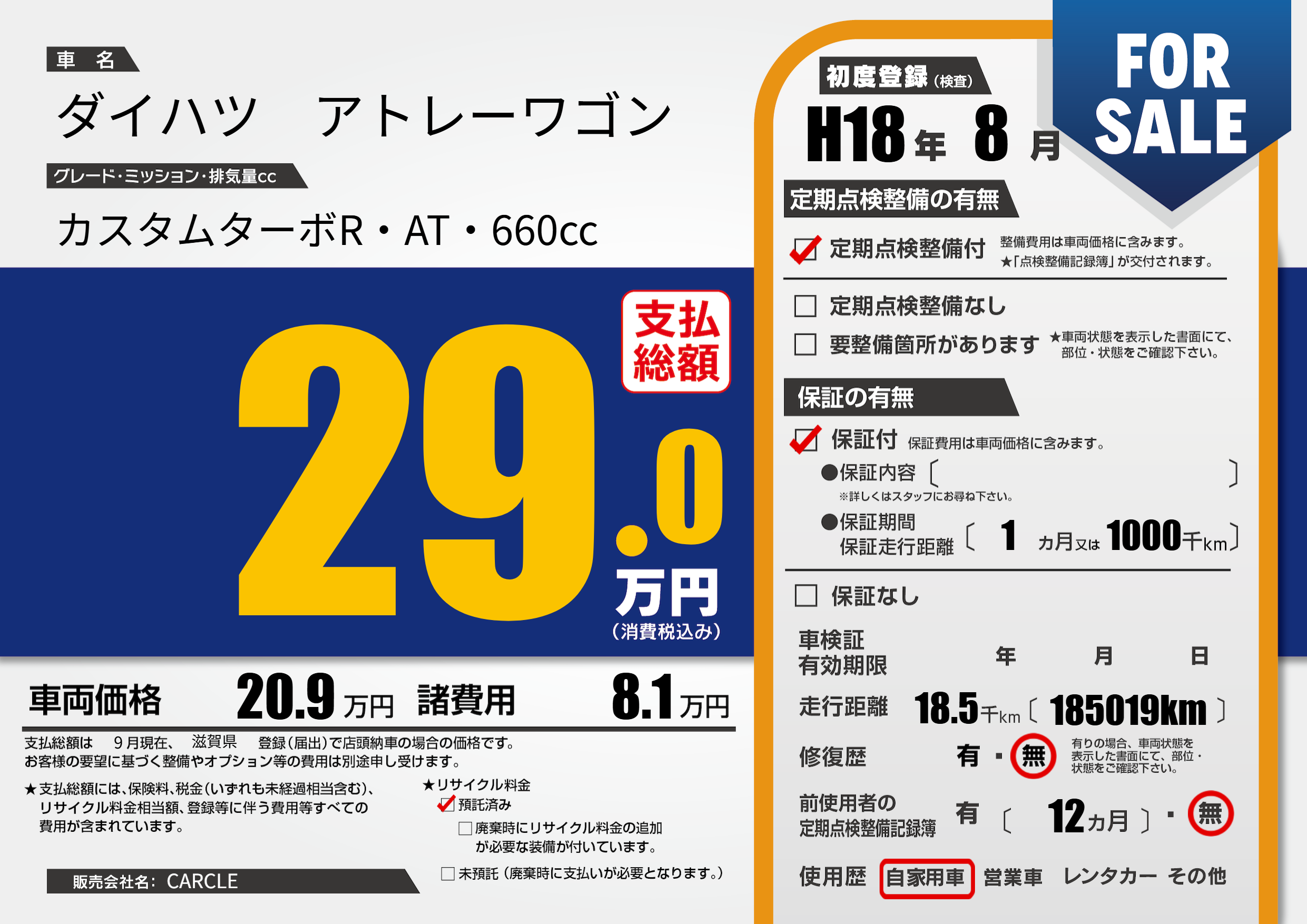 | 走行キロ | 1.8万km | 初年度登録 | H18年8月 |