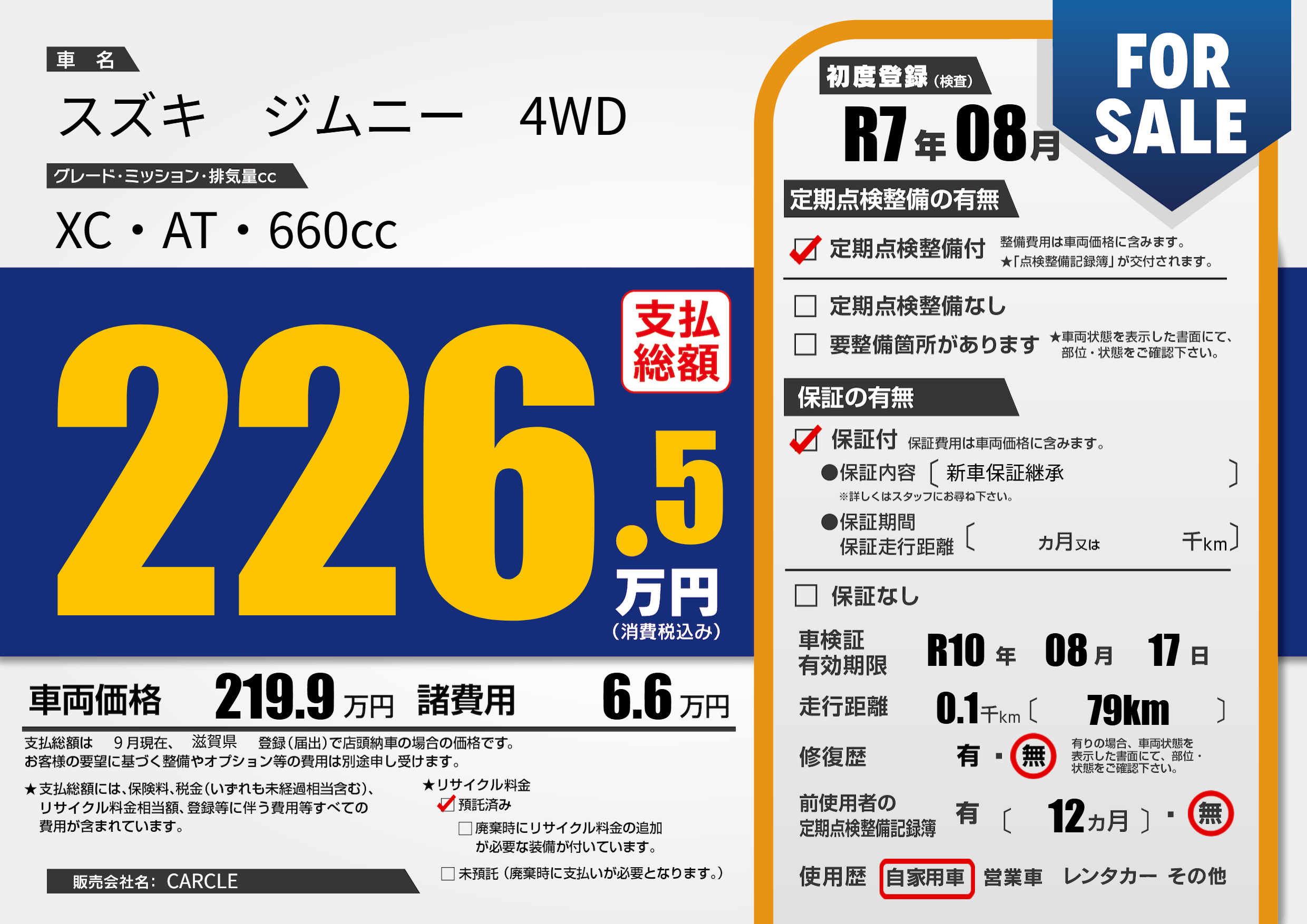 | 走行キロ | - | 初年度登録 | R7年08月 |