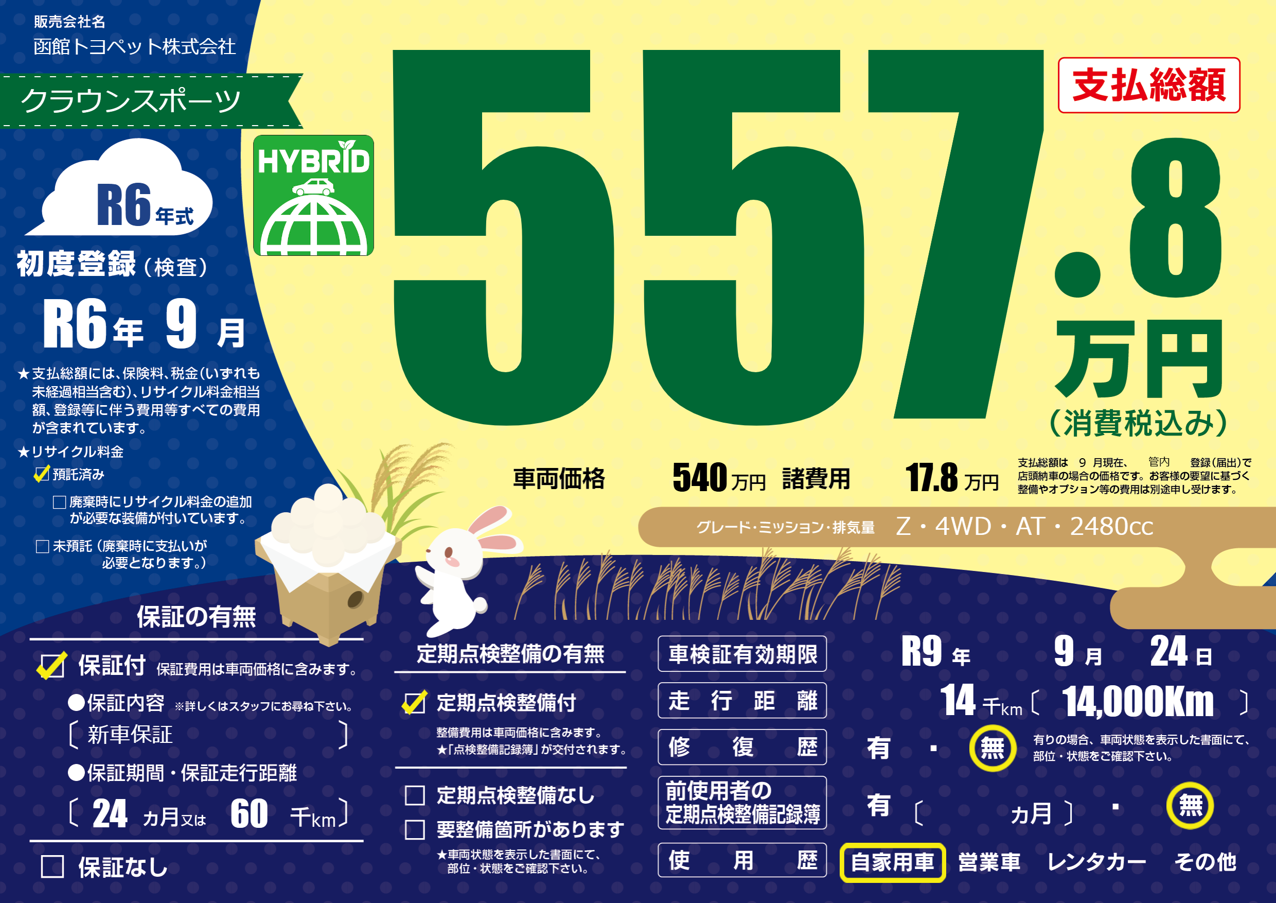 | 走行キロ | 1.4万km | 初年度登録 | R6年9月 |