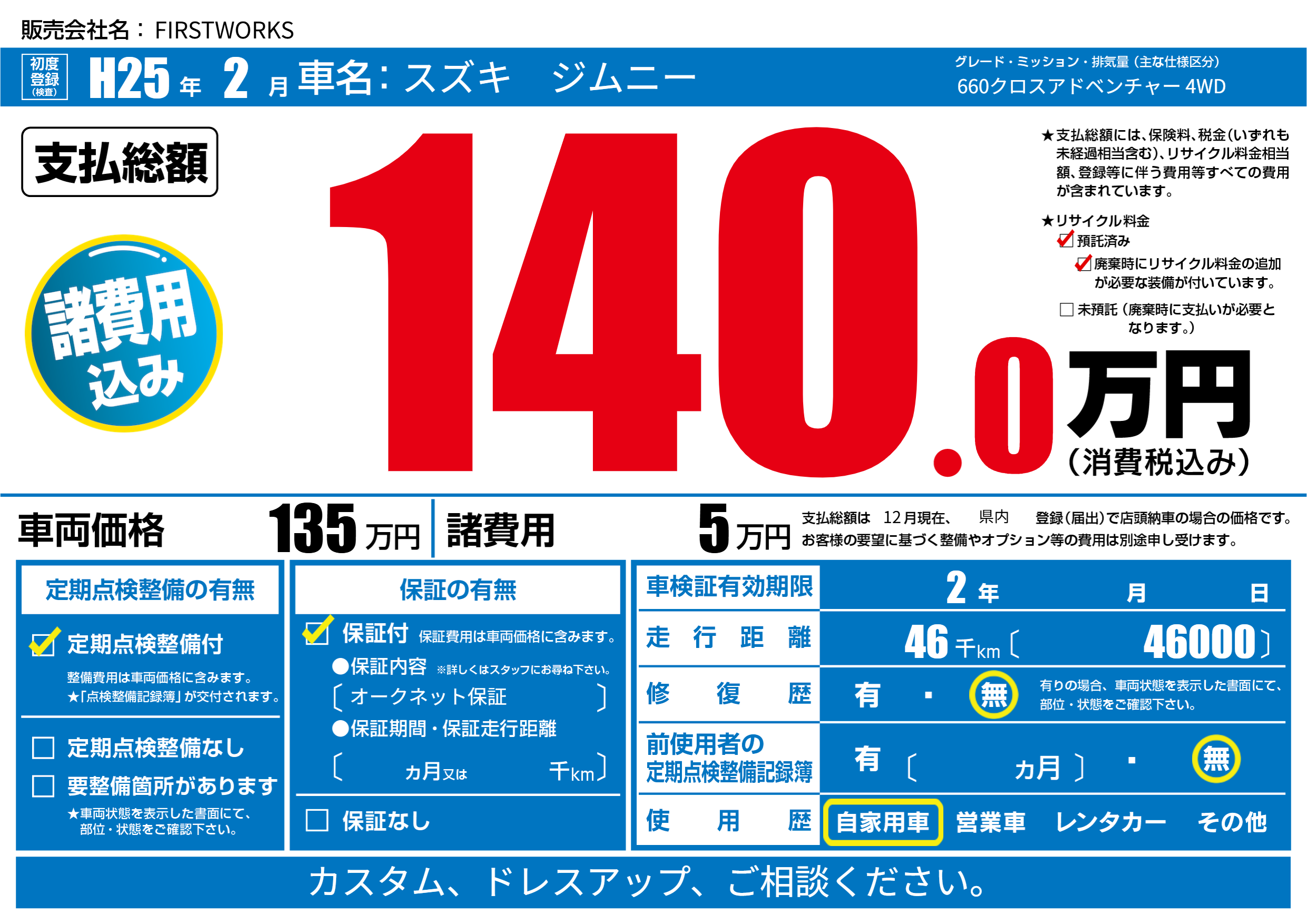 | 走行キロ | 4.6万km | 初年度登録 | H25年2月 |