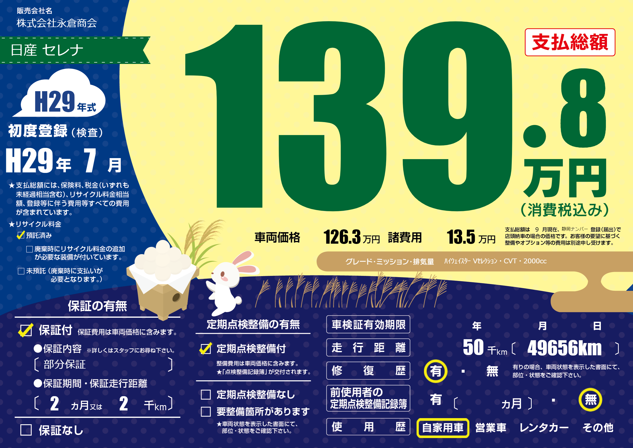 | 車名 | 日産 セレナ | グレード ミッション 排気量 |