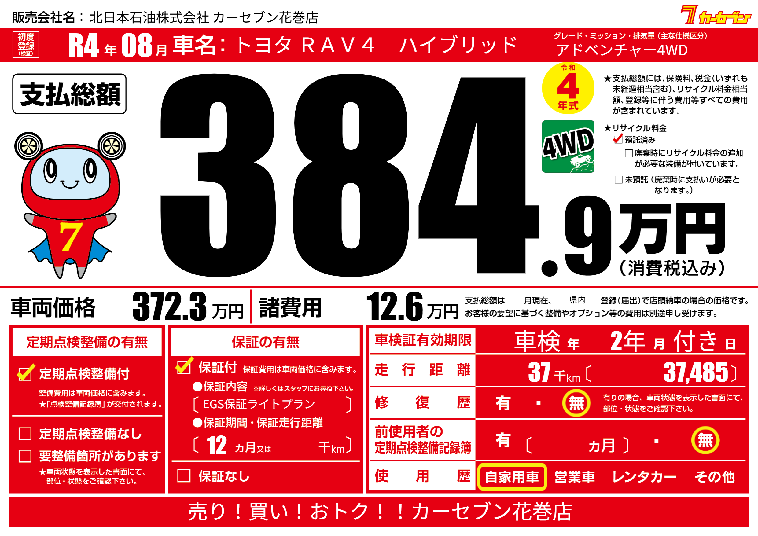 | 走行キロ | 3.7万km | 初年度登録 | R4年08月 |
