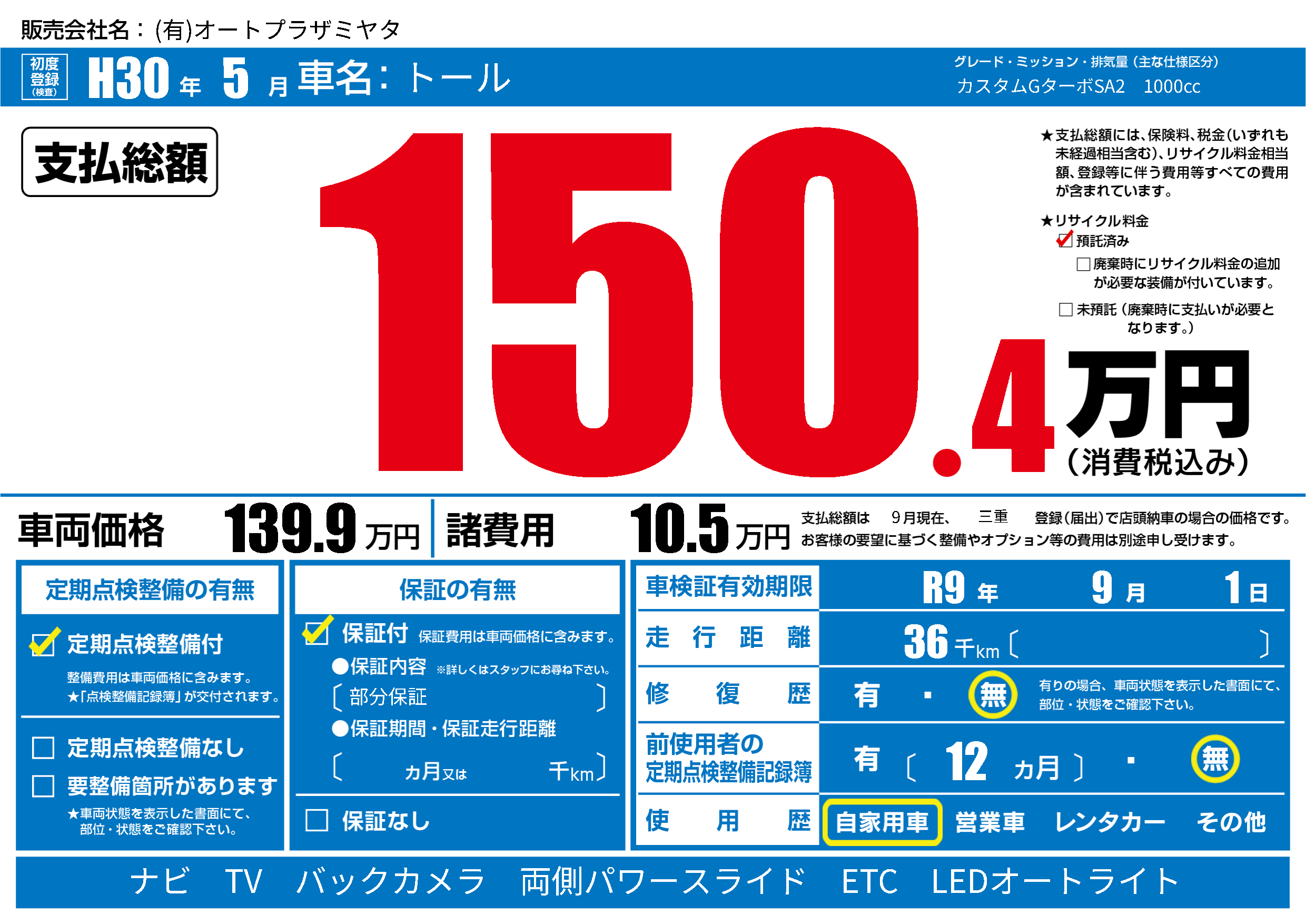 | 走行キロ | 3.6万km | 初年度登録 | H30年5月 |