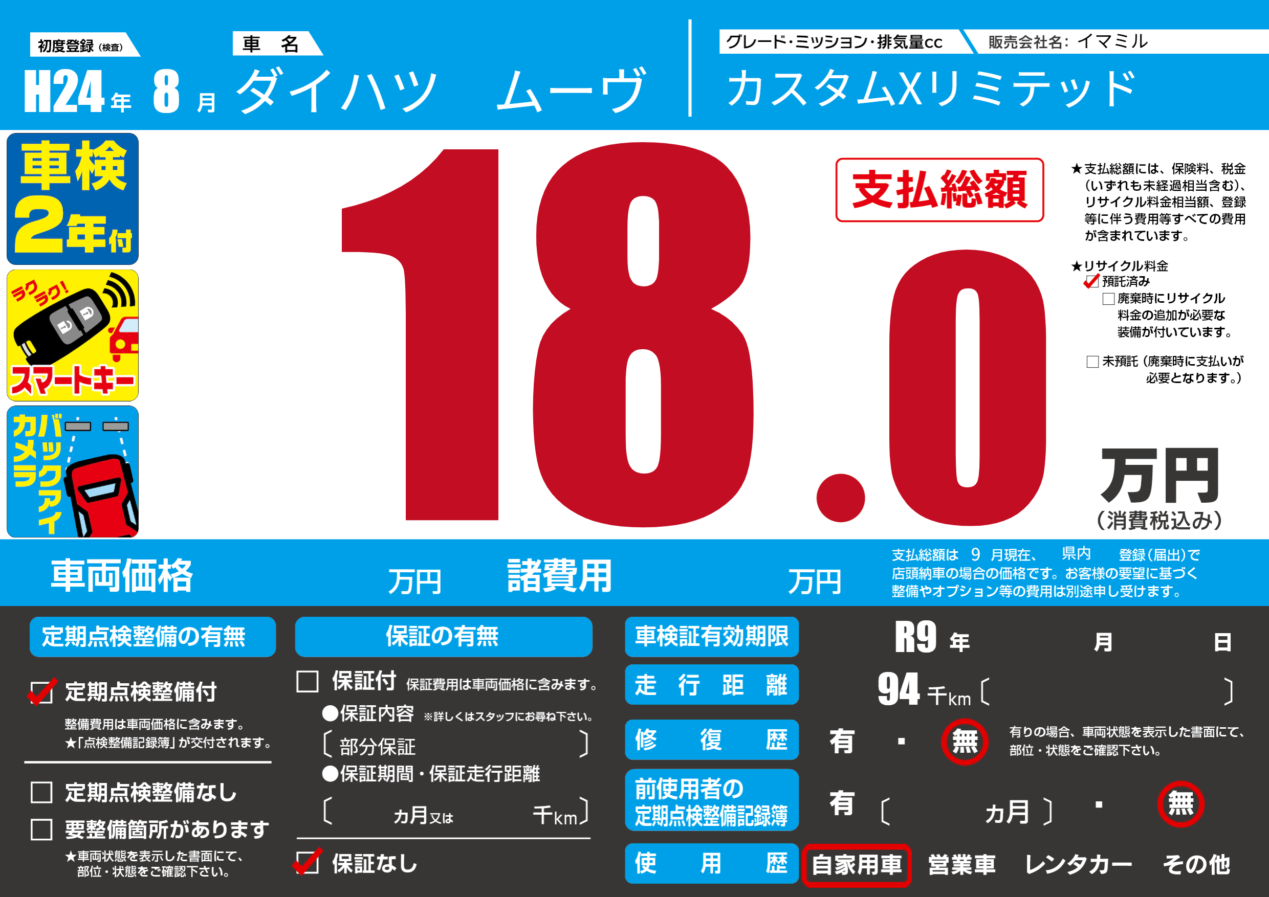 | 走行キロ | 9.4万km | 初年度登録 | H24年8月 |