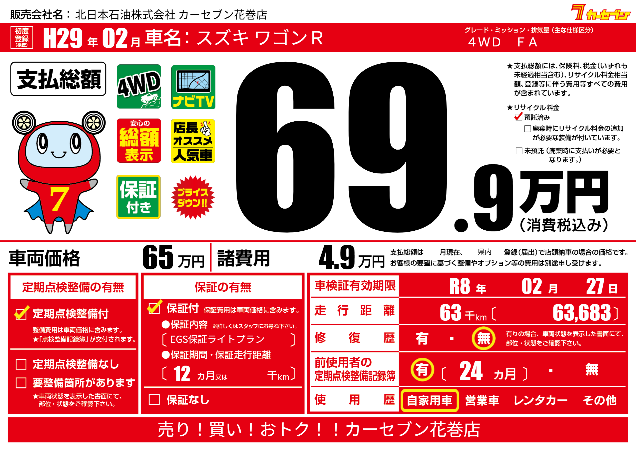 | 走行キロ | 6.3万km | 初年度登録 | H29年02月 |