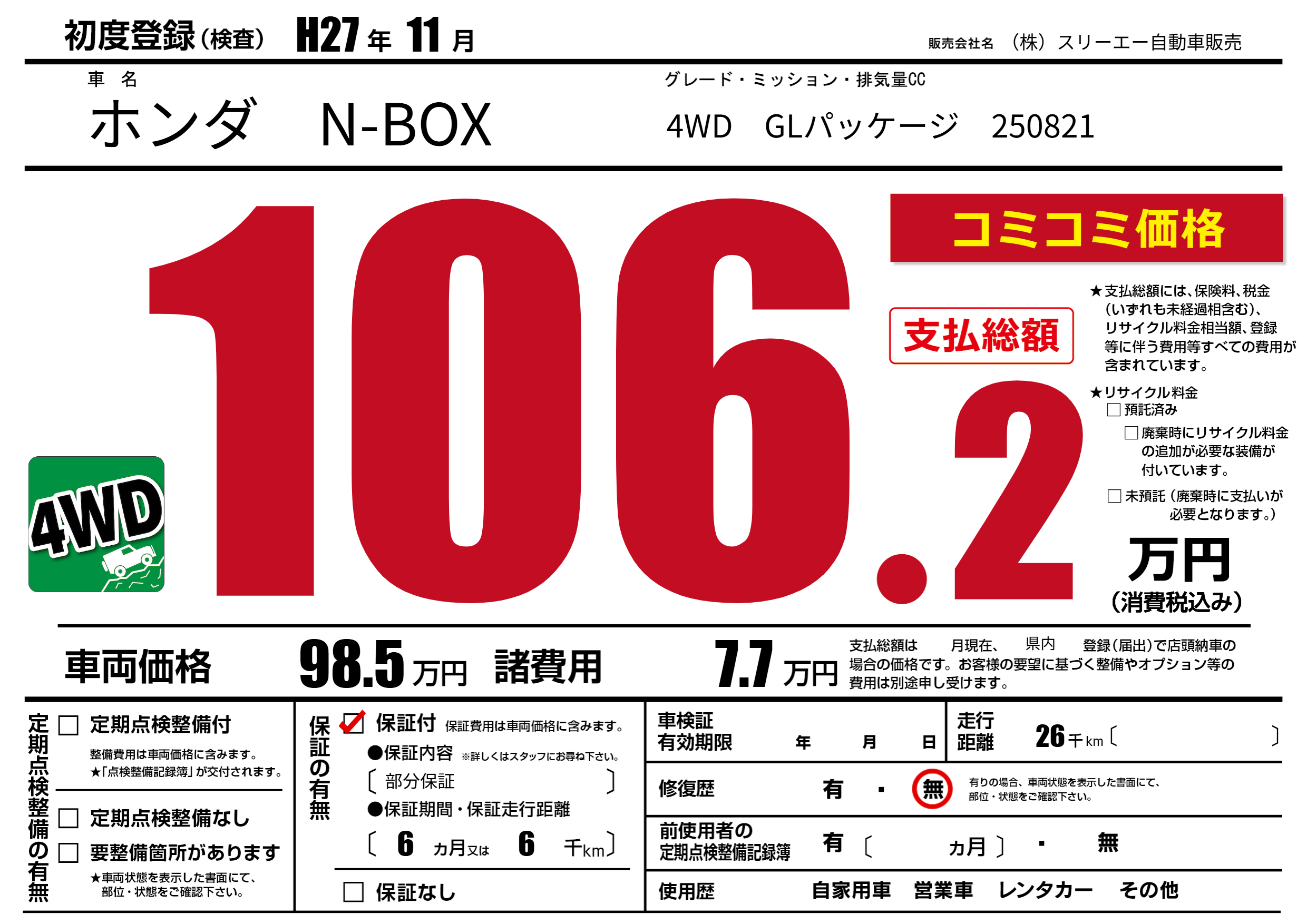 | 車名 | ホンダ N-BOX | グレード ミッション 排気量 |