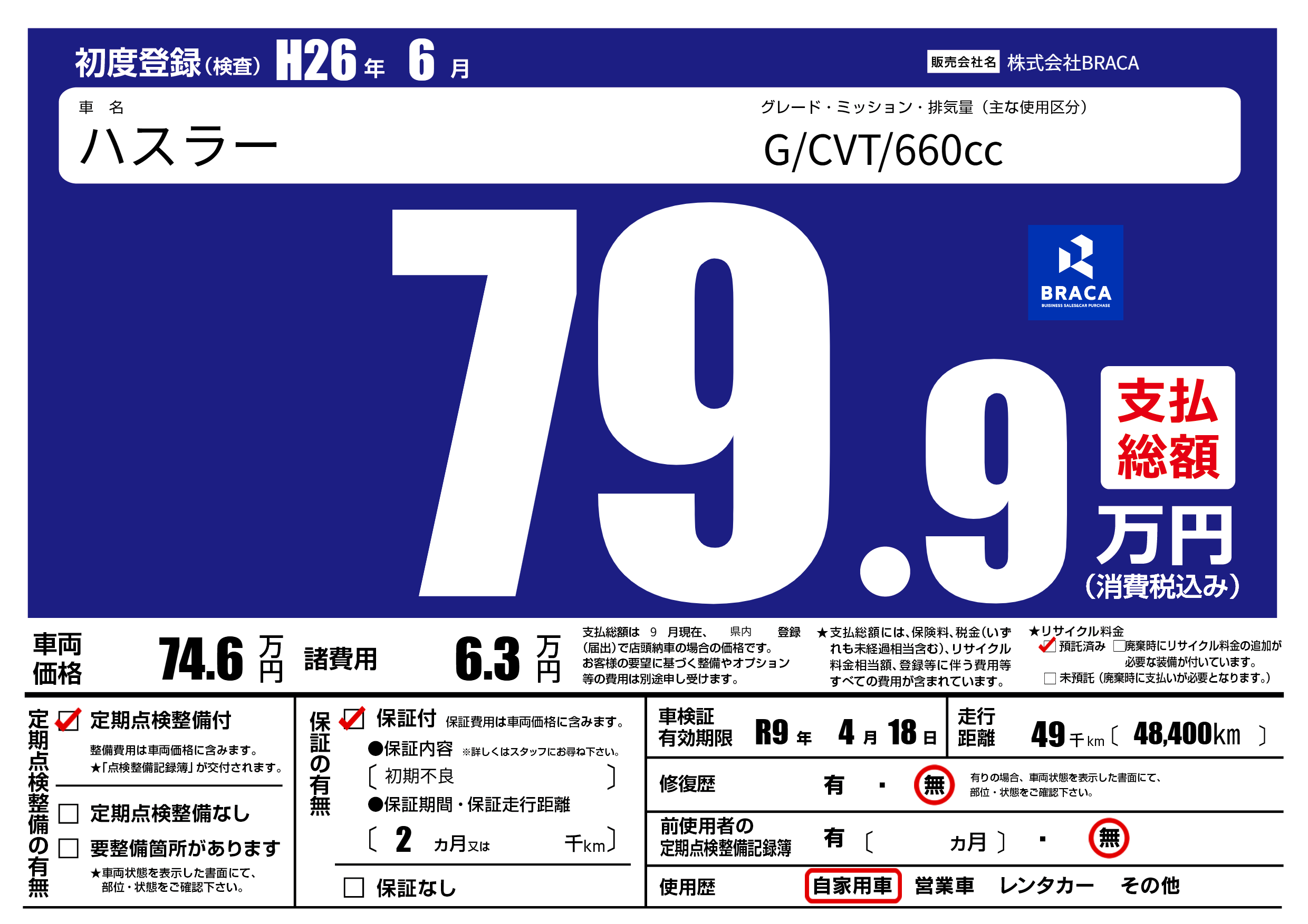 | 走行キロ | 4.9万km | 初年度登録 | H26年6月 |