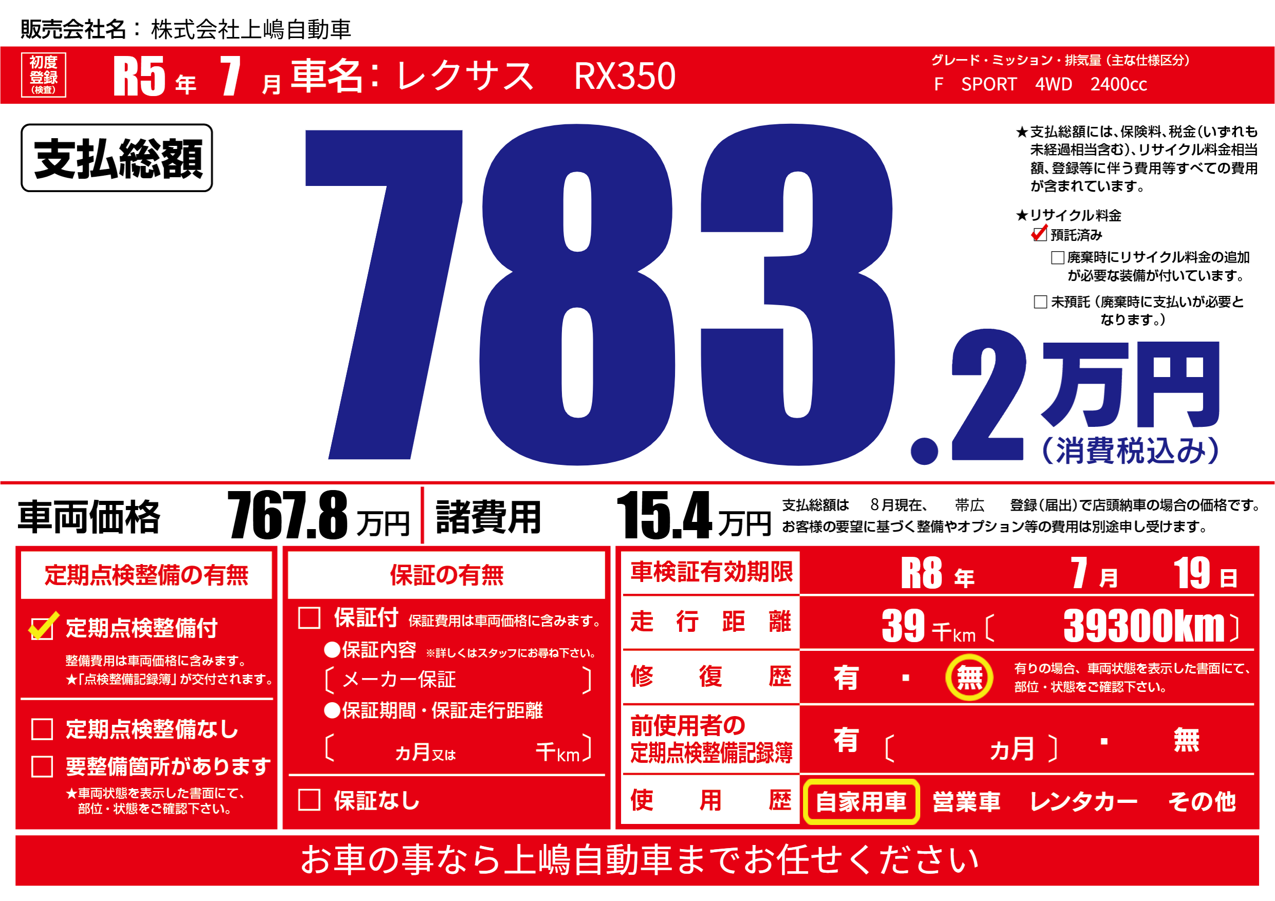 | 車名 | レクサス RX350 | グレード ミッション 排気量 |