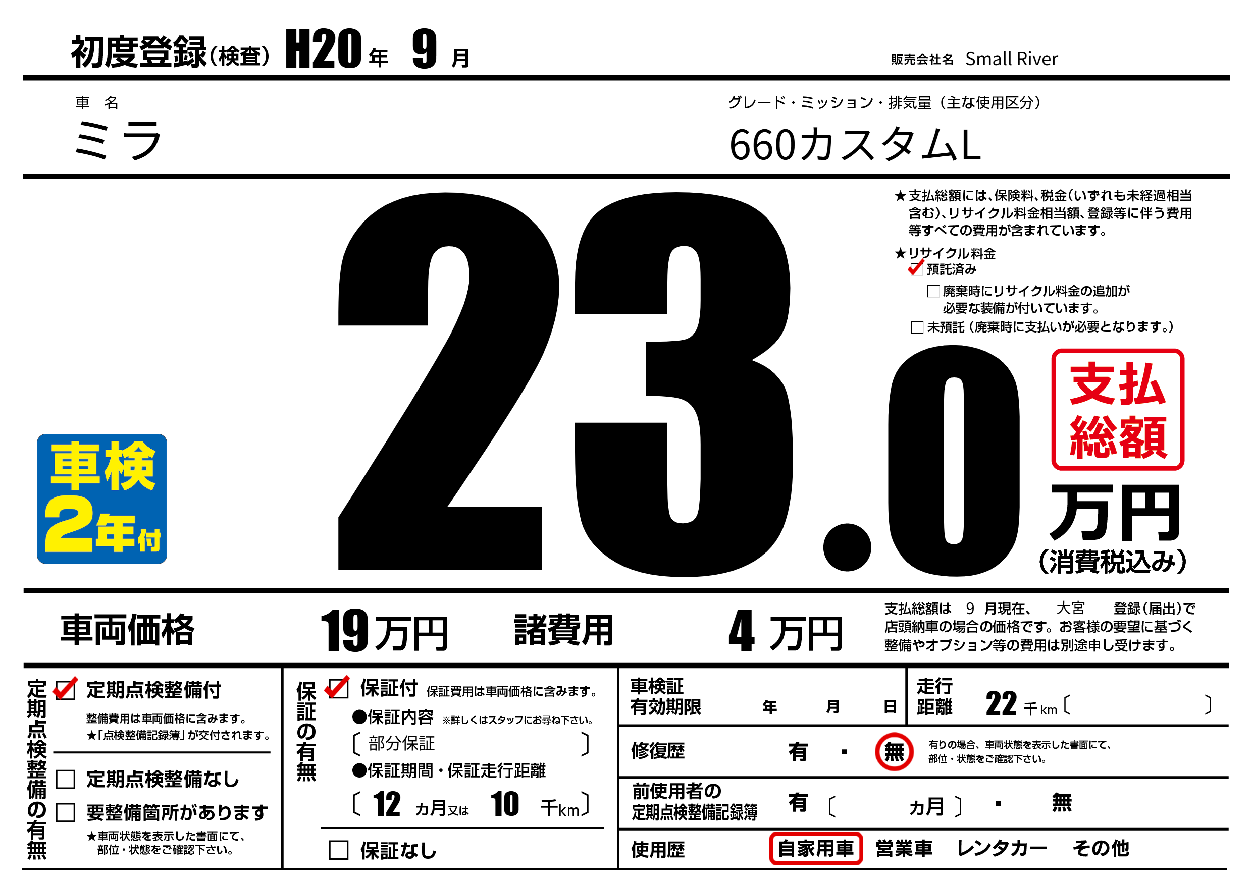 | 走行キロ | 2.2万km | 初年度登録 | H20年9月 |
