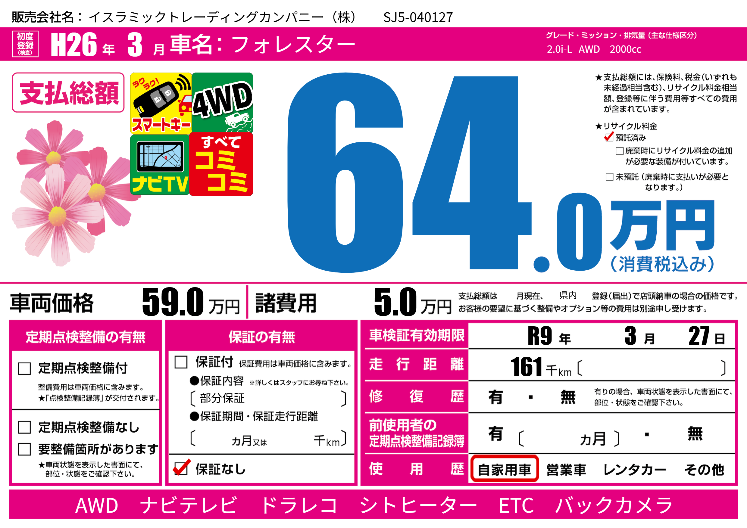 なし | 車検制限 | R9年3月27月 |