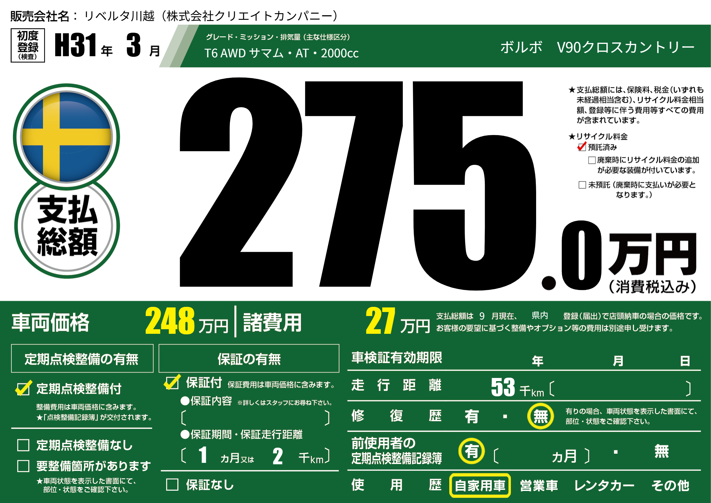 | 車名 | ボルボ V90クロスカントリー | グレード ミッション 排気量 |