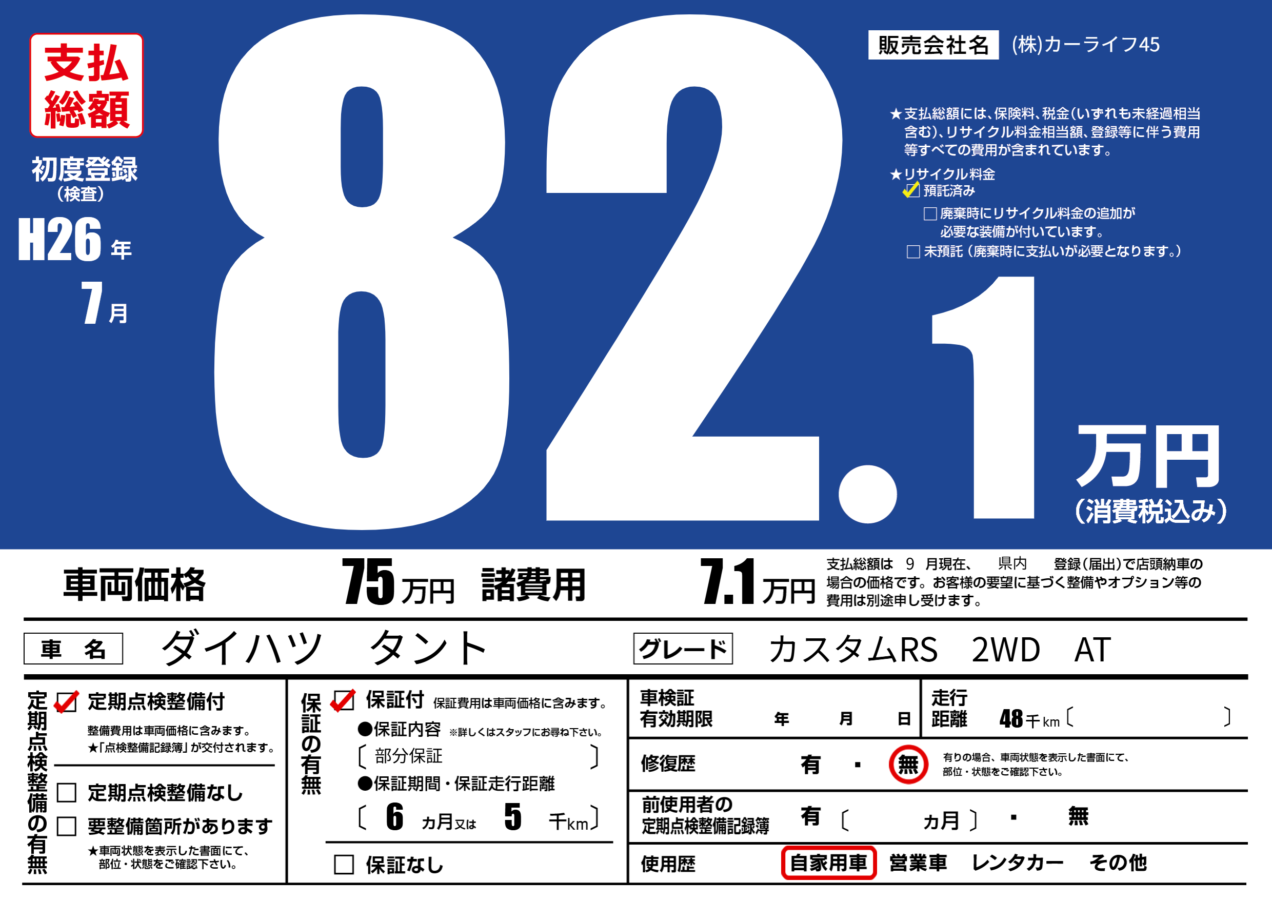 | 車名 | ダイハツ タント | グレード ミッション 排気量 |