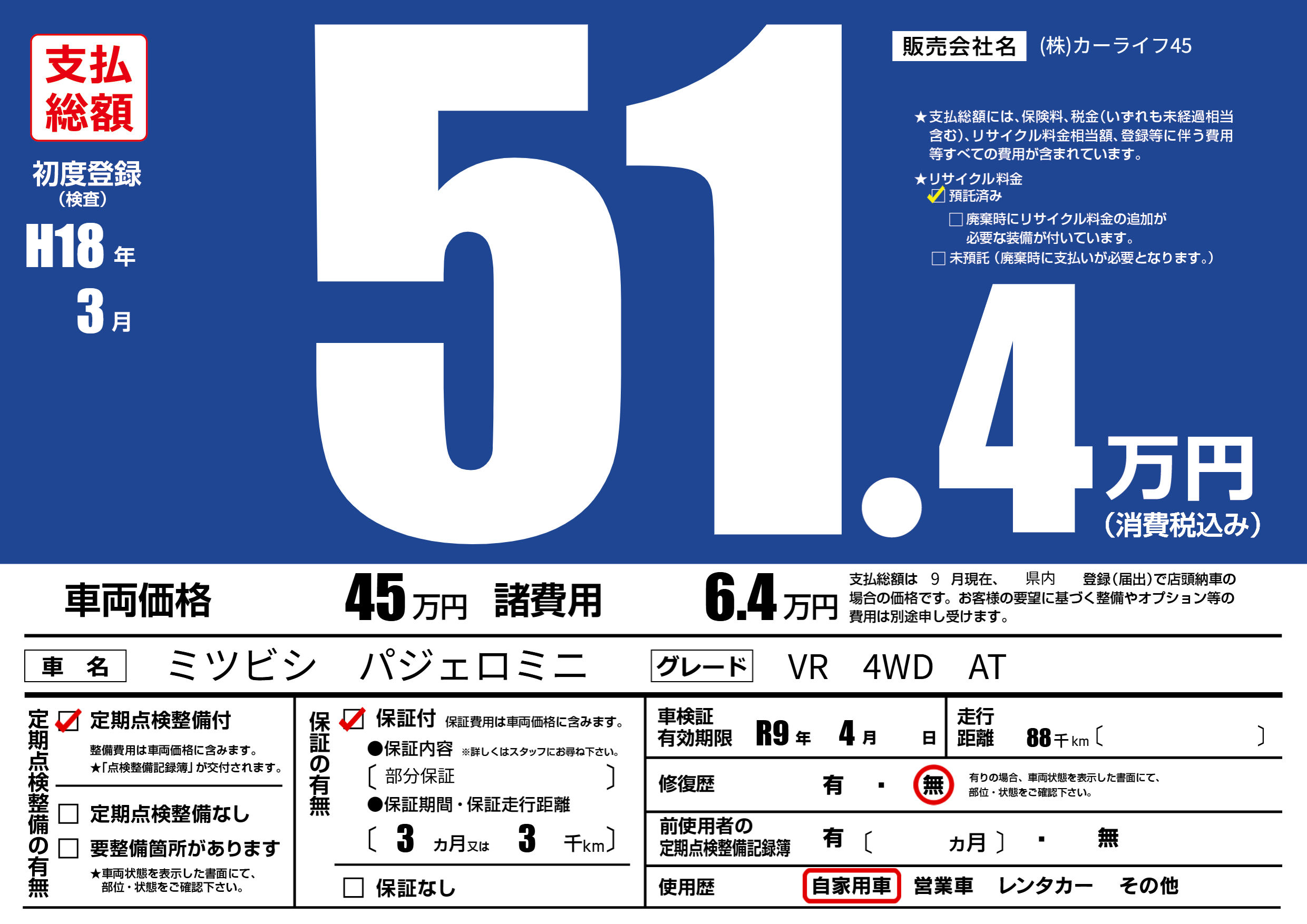 | 車名 | ミツビシ パジェロミニ | グレード ミッション 排気量 |