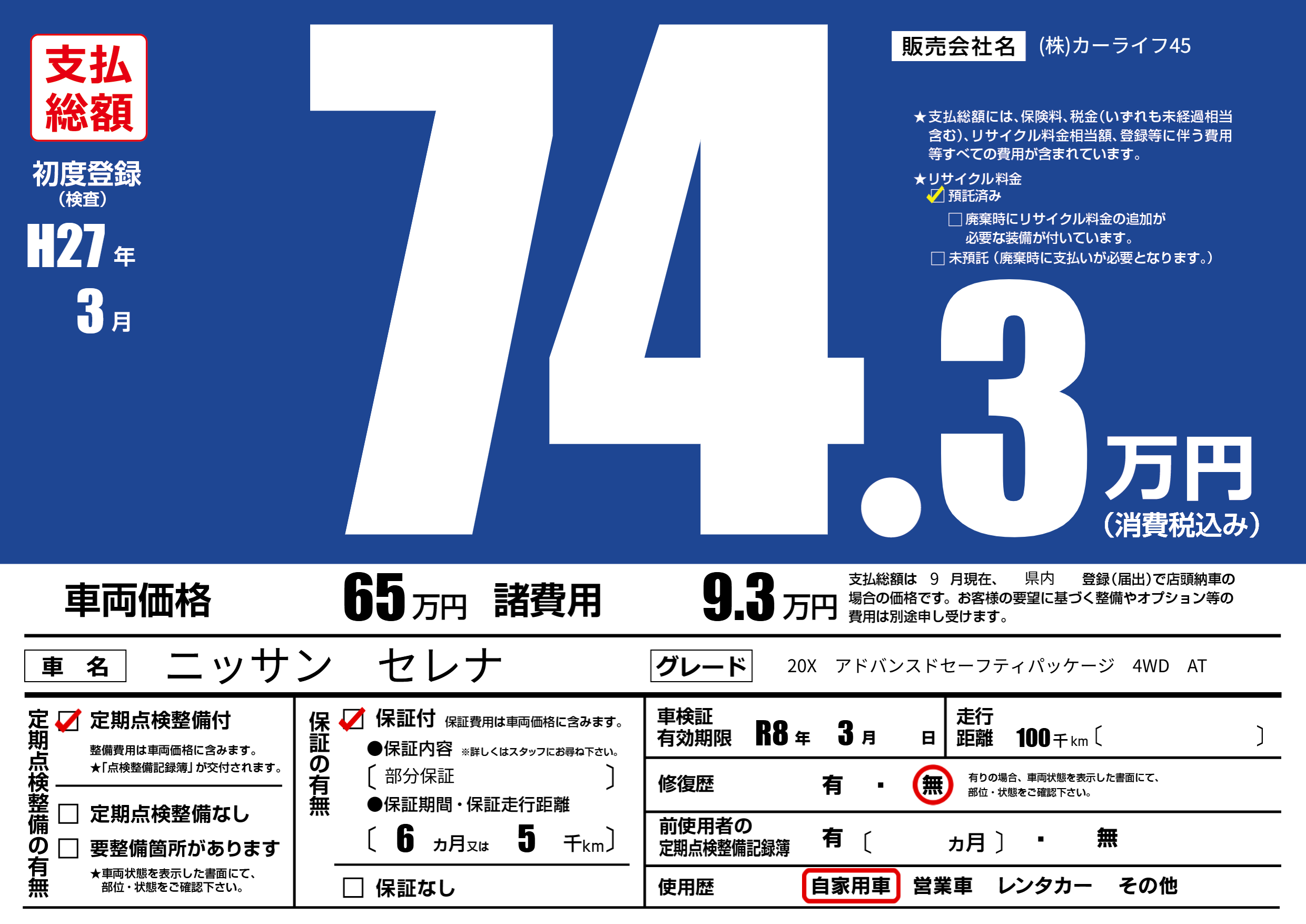| 走行キロ | 10万km | 初年度登録 | H27年3月 |