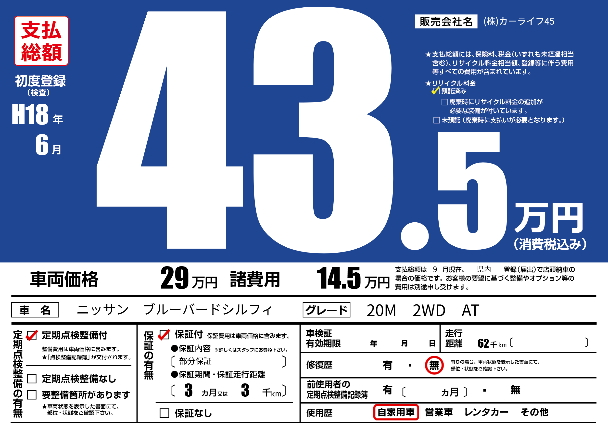 | 車名 | ニッサン ブルーバードシルフィ | グレード ミッション 排気量 |