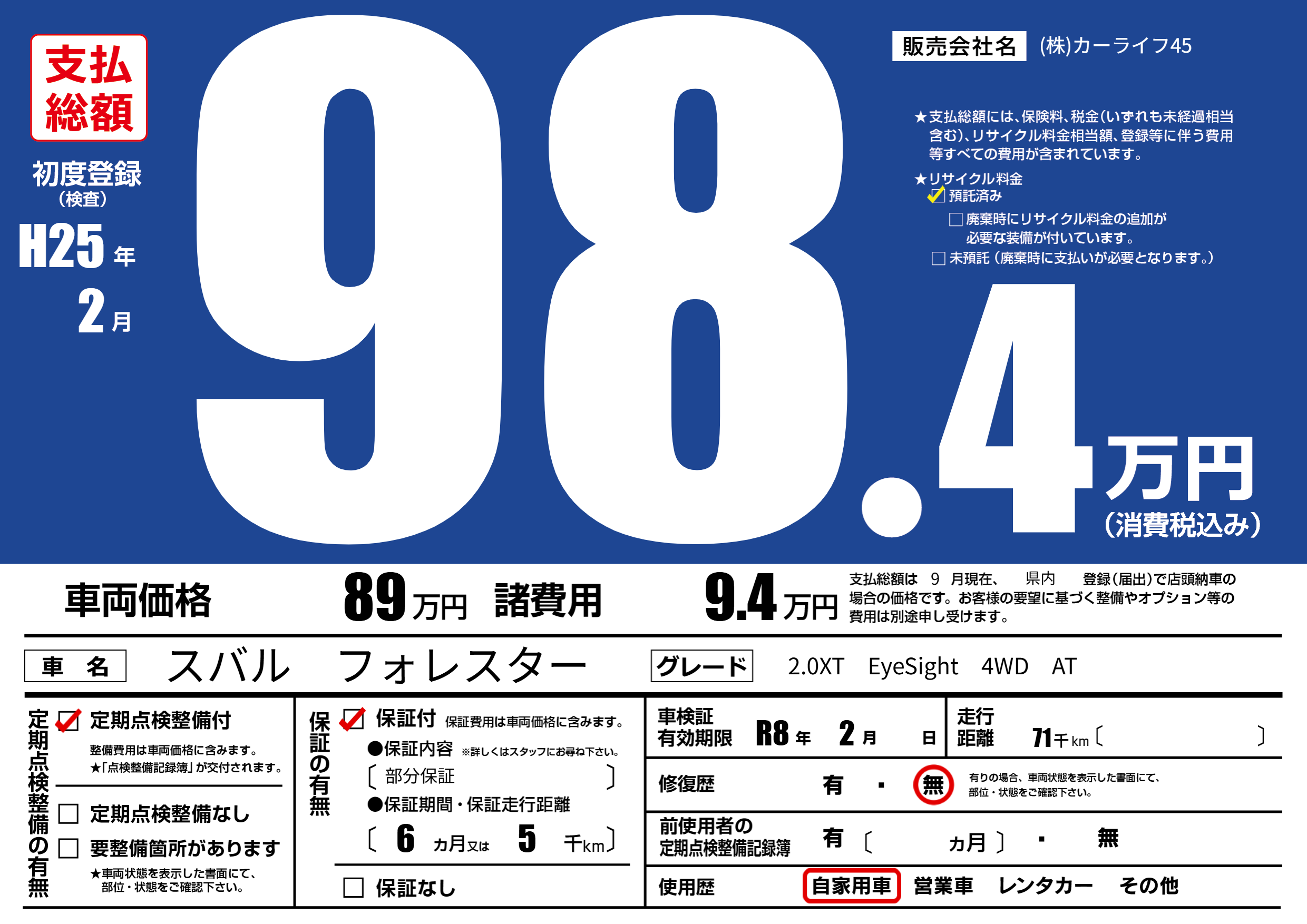 | 車名 | スバル フォレスター | グレード ミッション 排気量 |