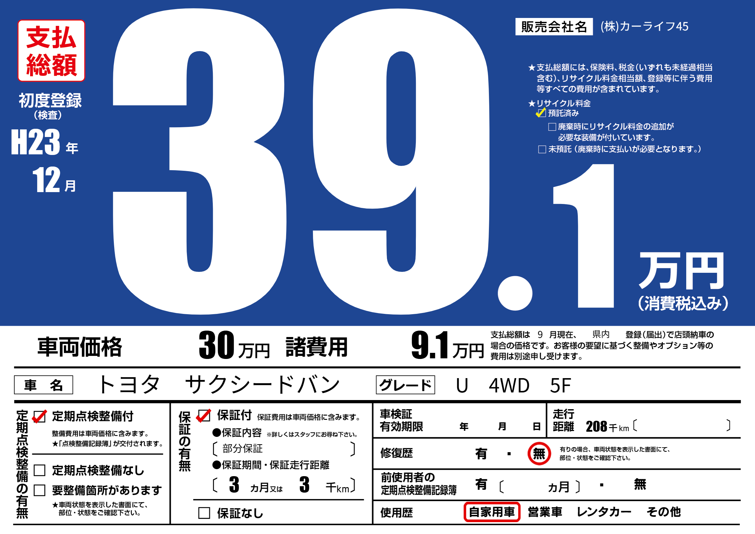 | 走行キロ | 20.8万km | 初年度登録 | H23年12月 |
