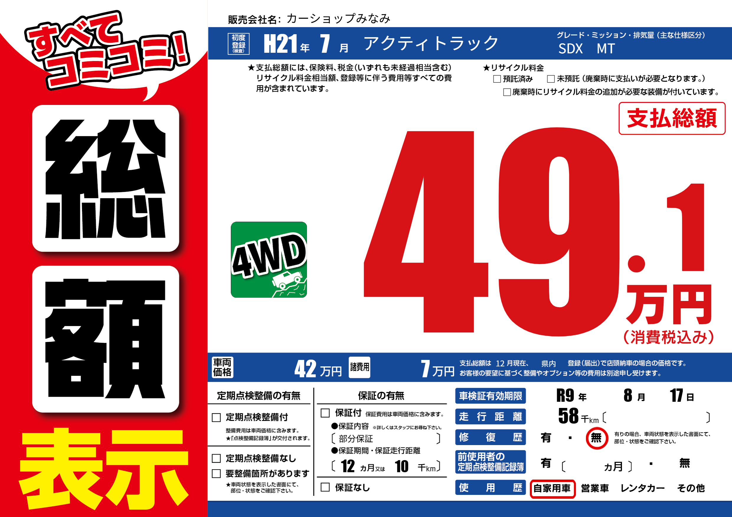 | 車名 | アクティトラック | グレード ミッション 排気量 |