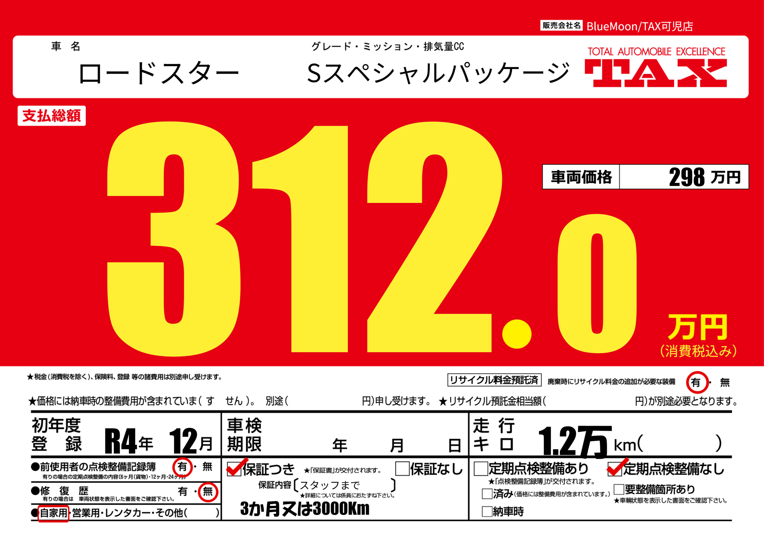 保証付き 保証内容(スタッフまで) ---ヶ月または()千kmまで |