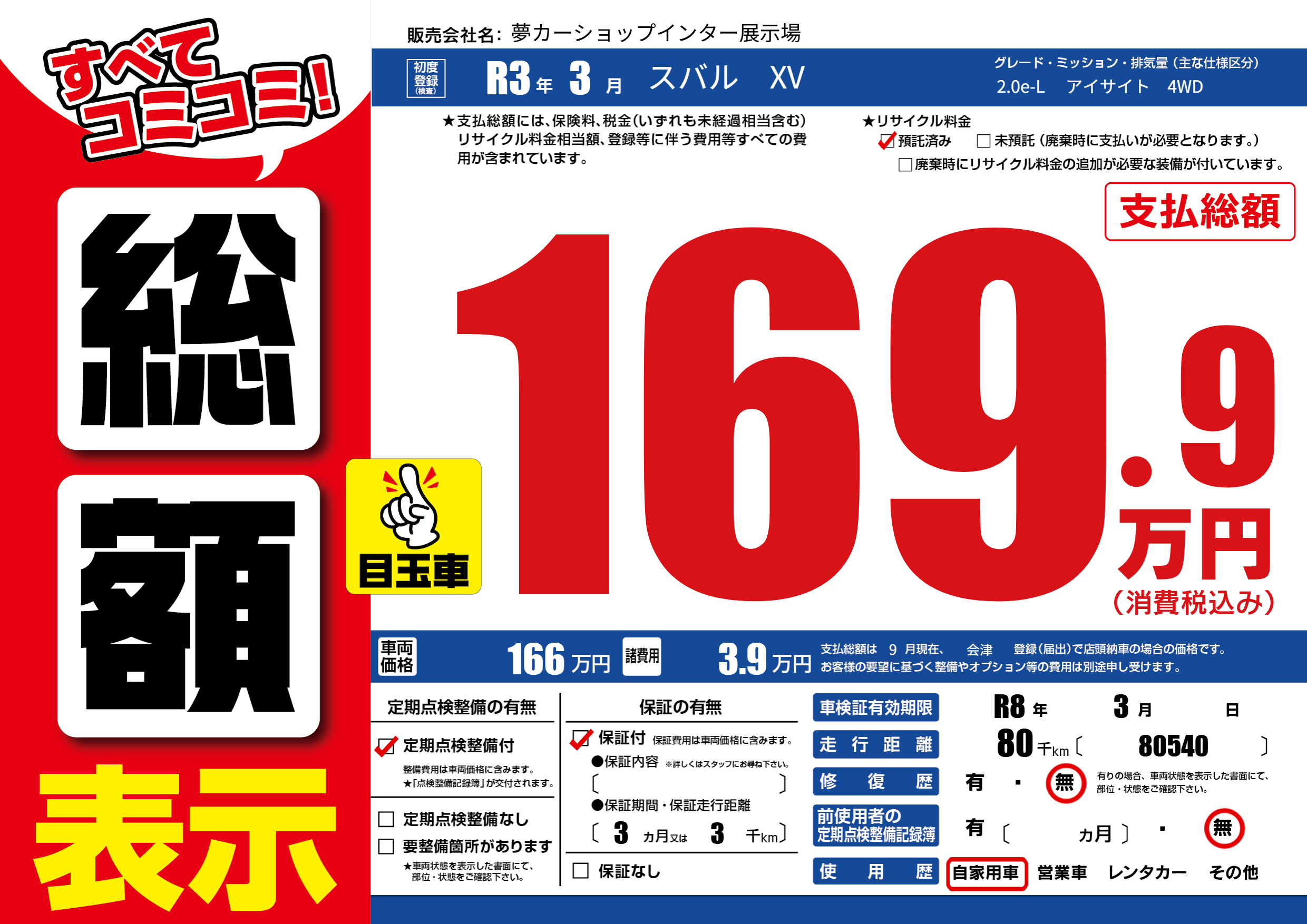 | 車名 | スバル XV | グレード ミッション 排気量 |