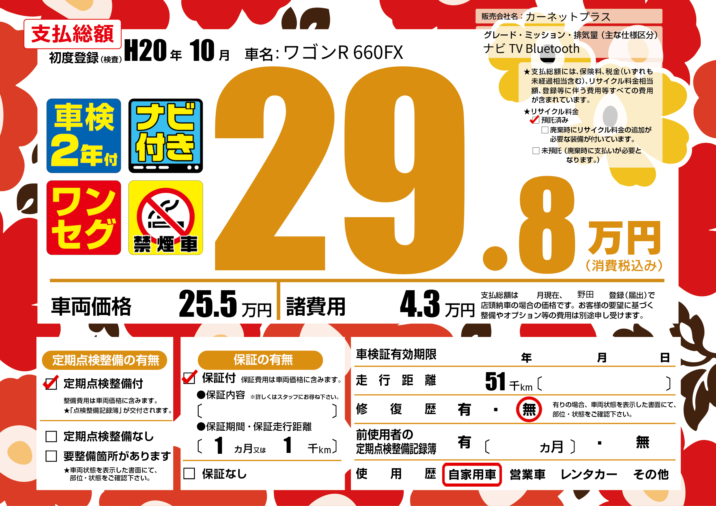 | 車名 | ワゴンR 660FX | グレード ミッション 排気量 |