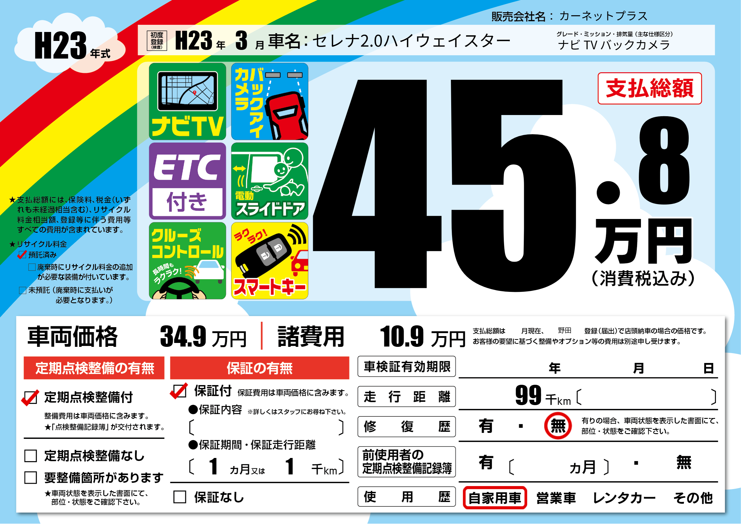 | 車名 | セレナ2.0ハイウェイスター | グレード ミッション 排気量 |