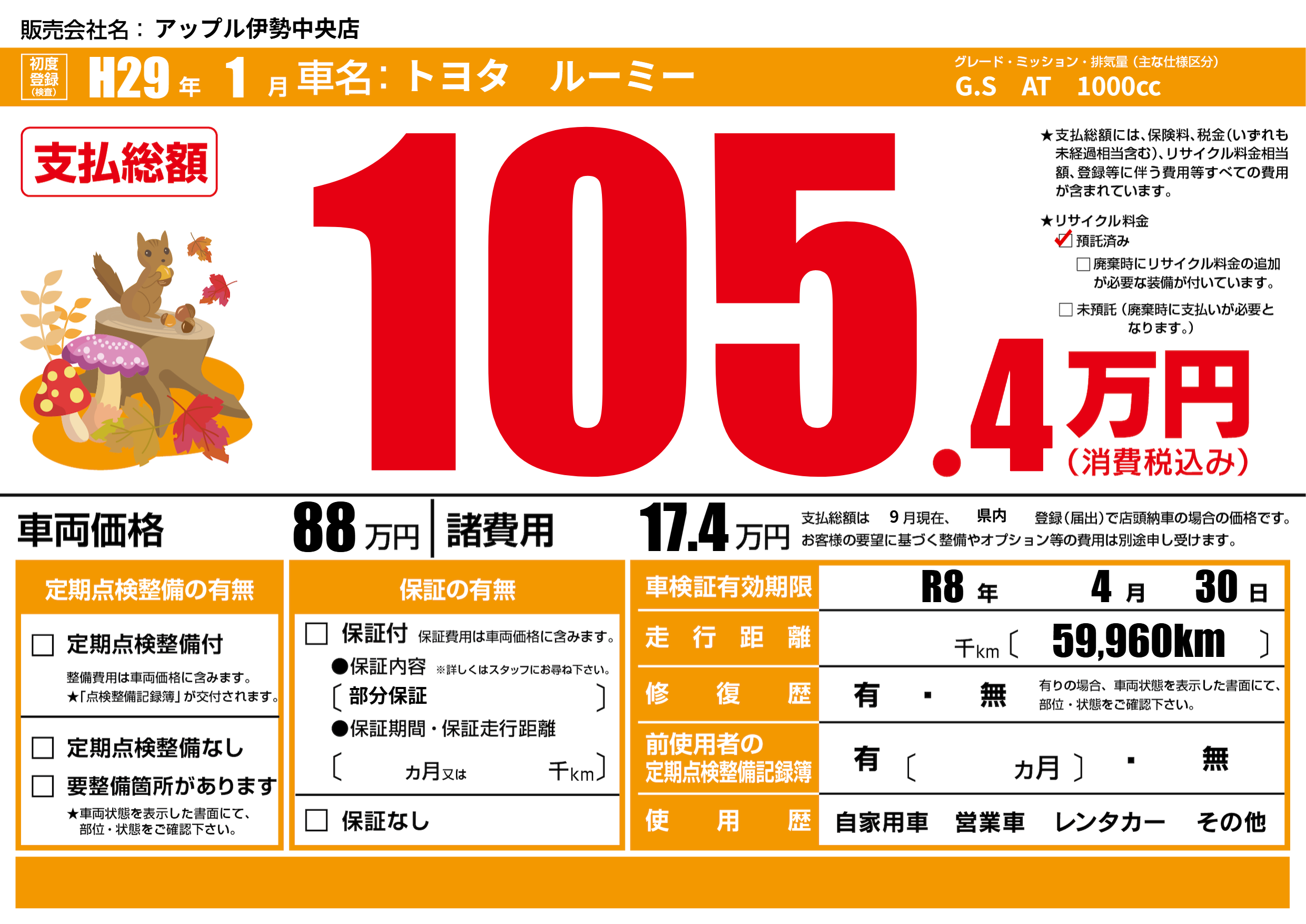 | 車名 | トヨタ ルーミー | グレード ミッション 排気量 |
