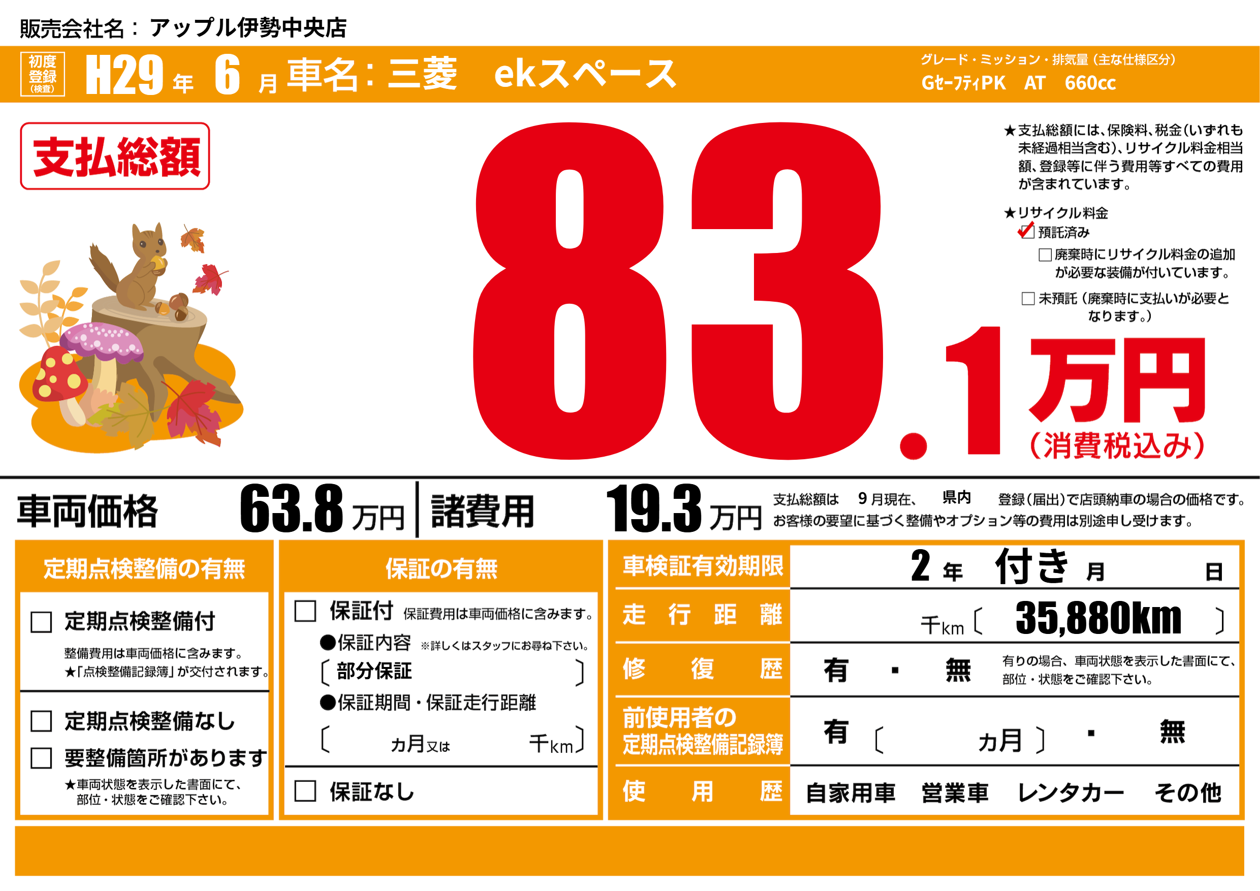 | 車名 | 三菱 ekスペース | グレード ミッション 排気量 |
