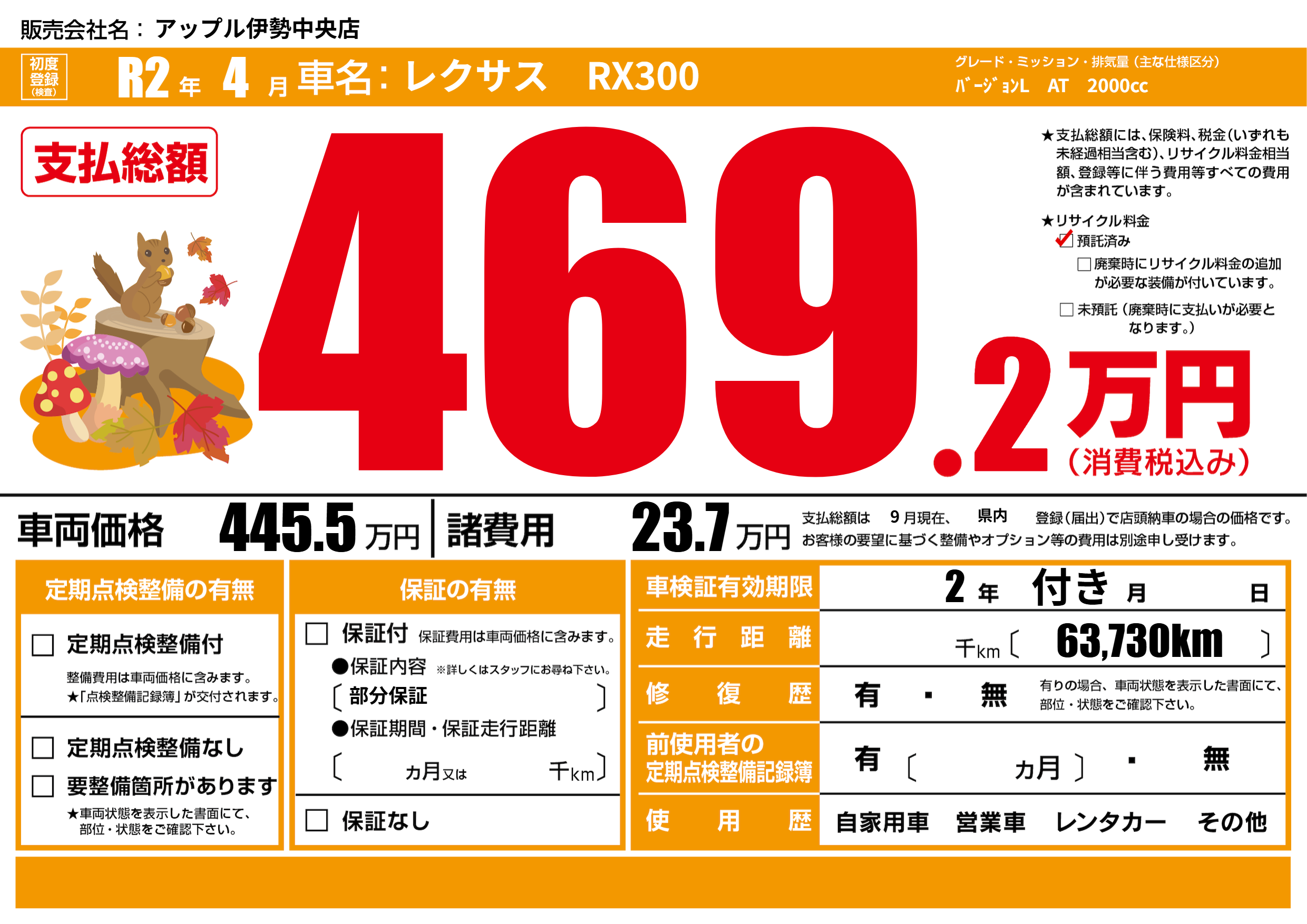 | 車名 | レクサス RX300 | グレード ミッション 排気量 |