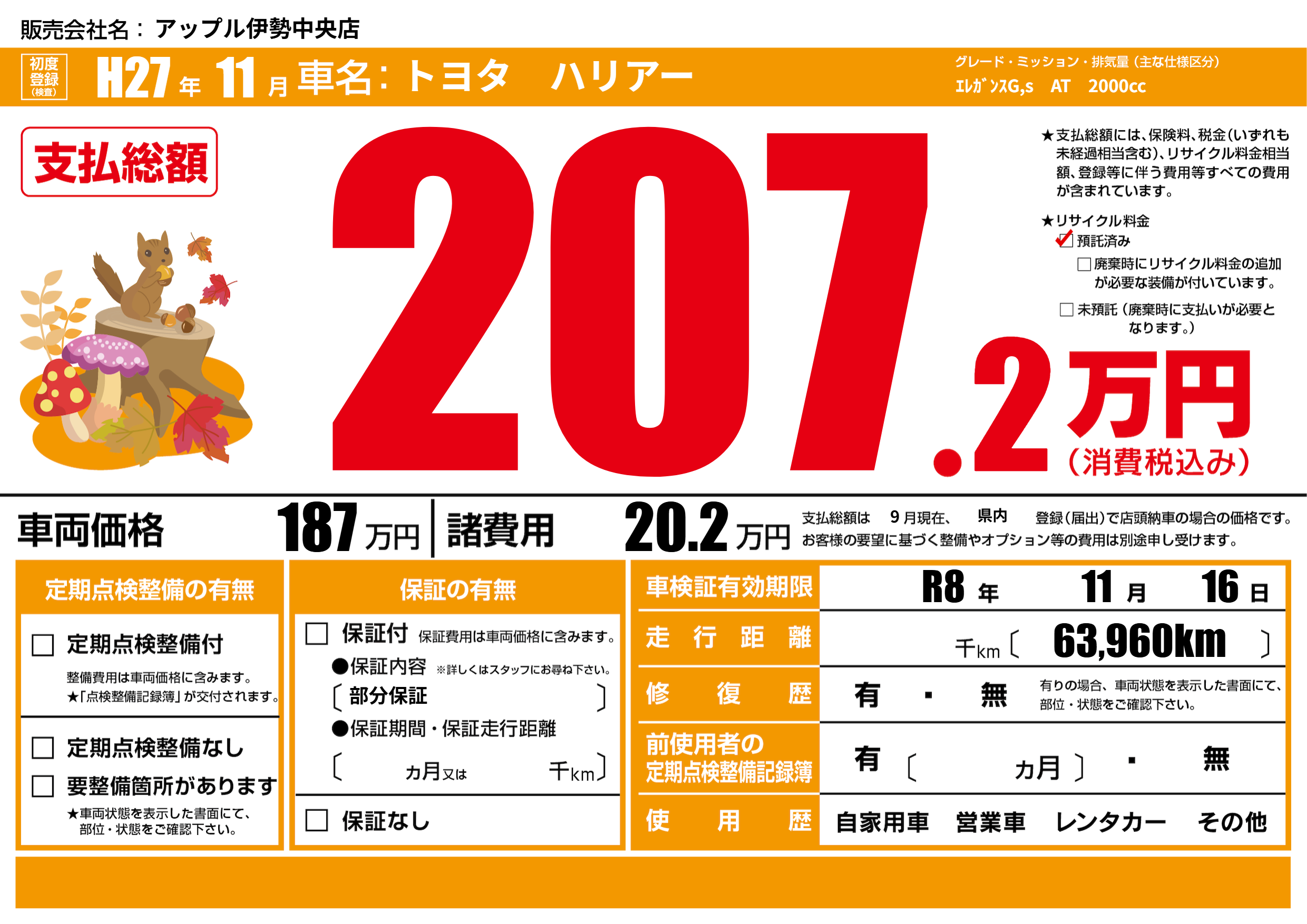 | 車名 | トヨタ ハリアー | グレード ミッション 排気量 |